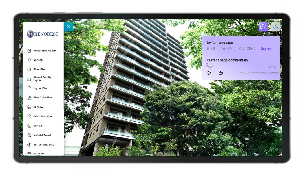 HOME VISTAは、パースギャラリー、コンセプト紹介、フロア図、間取り図、眺望集、モデルルーム(CGVR)、カラーシミュレーション、住戸表、周辺マップ機能、カレンダー、ローンシミュレーション、資料集などを搭載いただけます。また、マテリアルボードの搭載、建材プラットフォーム「ArchLOG」との情報連携で建材情報をデータ化、提案時のご説明、ご提案をスムーズに。また将来的にはリフォーム等で建材確認する際にも便利な状態を目指してます。