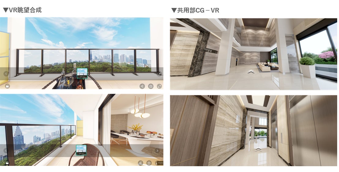 CGVRは共有部でも制作可能。エントランスの雰囲気からエレベーターホールなど 物件ごとの個性を伝えることもできます。また、眺望も実際の写真と合成してリアルな眺望を作成することもできるため、眺望が魅力の物件でも導入が進んでいます。