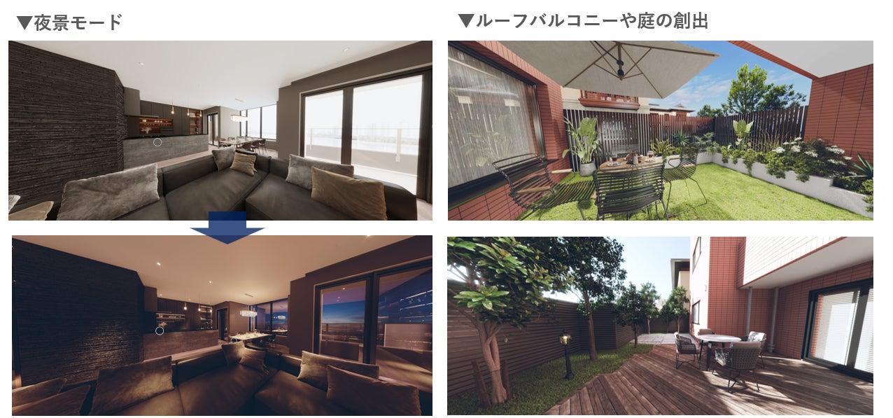 CGVRはルーフバルコニーや庭の創出も制作可能(※)。また夜景モードの制作も行っていますので、より一層、物件の魅力をお伝えすることができます。※CCGタイプのみが対応可能。