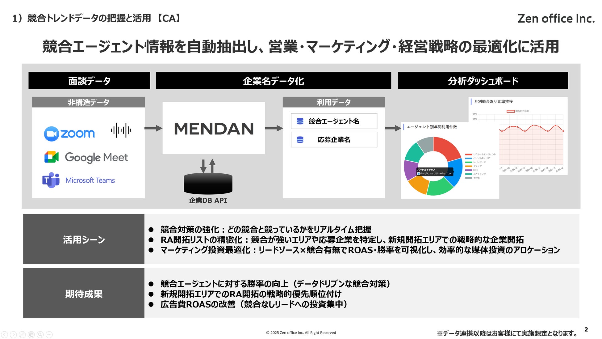 Zen office株式会社(本社:大阪市中央区、代表取締役:岩瀬 恭裕)は、人材紹介特化の音声×AIエージェント「MENDAN」に、新機能「音声データ施策活用」機能を追加いたしました。面談・商談の音声データから「競合エージェント名」「応募企業」「クロスセル機会」などを自動抽出し、CRM・BIツールと連携。データドリブンな競合対策と、顧客あたり売上・粗利の最大化を実現します。