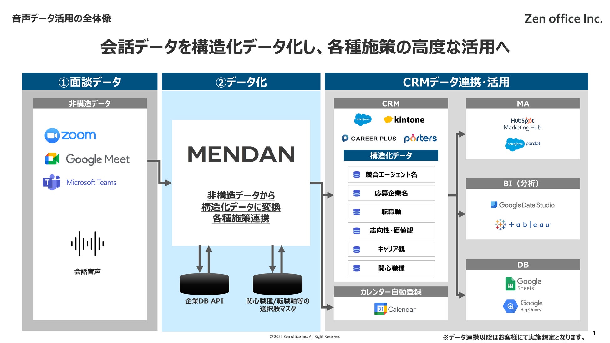 人材紹介における面談・商談の会話には、求職者の本音や企業の潜在ニーズなど、CRMの入力項目だけでは捉えきれない情報が詰まっています。MENDANはこの「非構造データ」を「構造化データ」に変換し、マーケティング・営業・経営のあらゆる施策に活用できる状態を実現します。