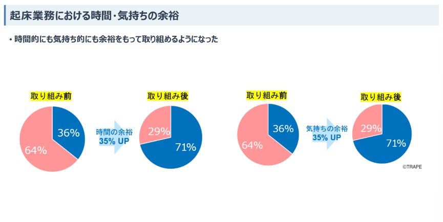 1日の業務の流れや時間帯ごとの職員配置の偏りを見直すことで、特に負担が集中していた夜勤から朝にかけての起床業務における職員の時間的・気持ち的余裕を生み出し、利用者の本位のケア提供に繋がった取り組み
