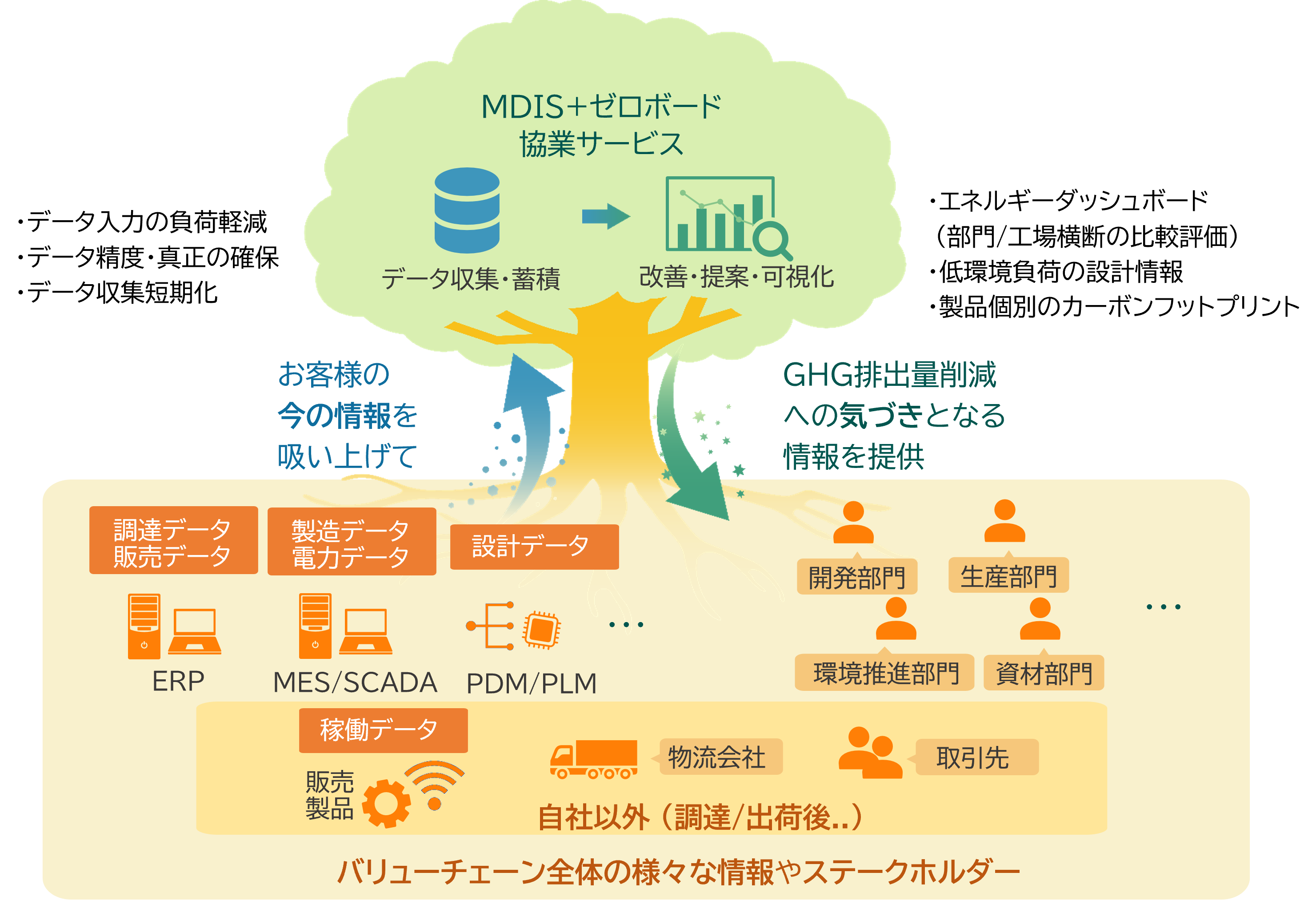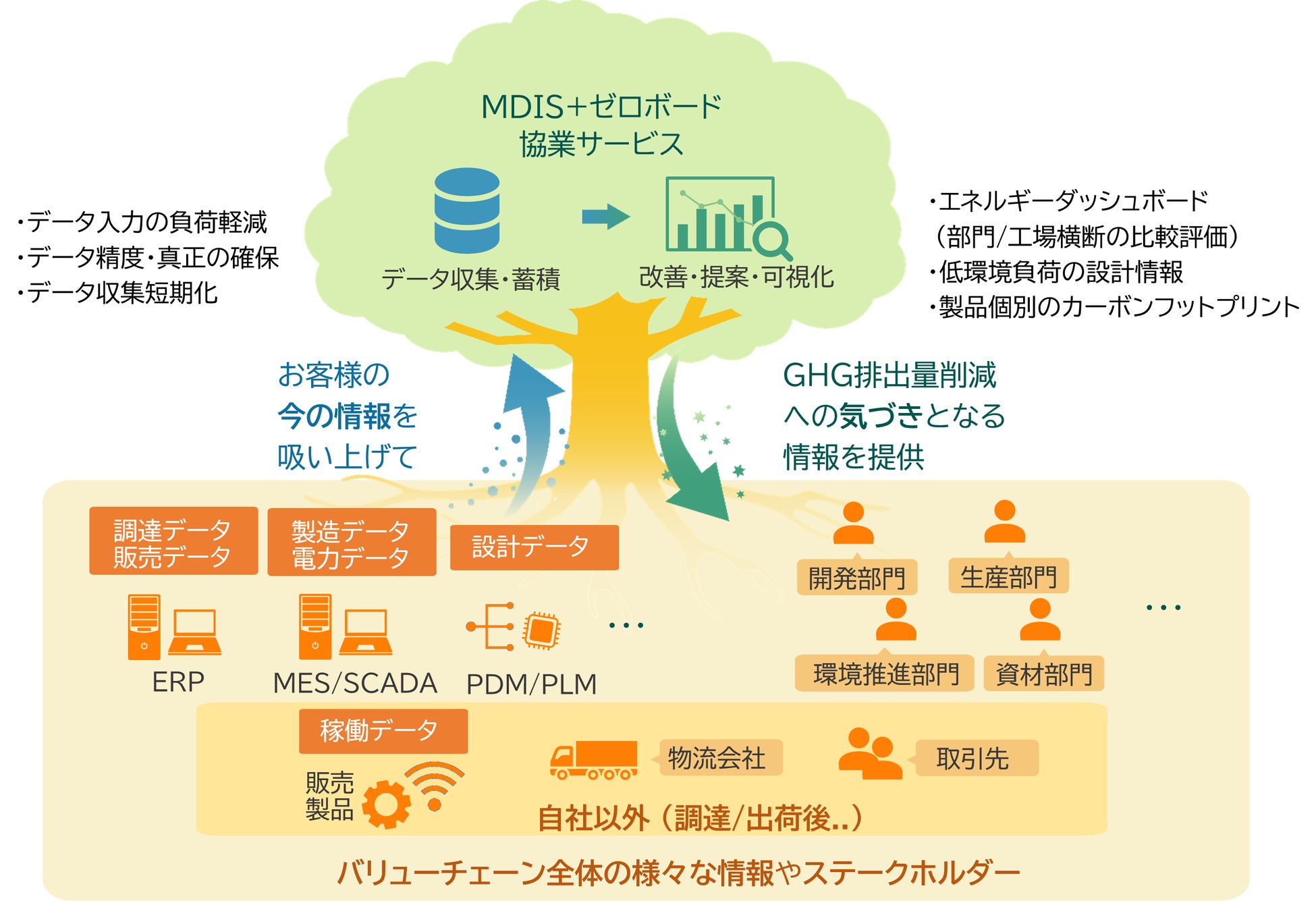 こうした社会的要求を踏まえて、製造業の基幹業務システム(ERP)、製造実行システム(MES)、製品ライフサイクルマネジメントシステム(PLM)など幅広いシステムの導入実績を持つMDISと、GHG排出量算定・可視化クラウドサービスを提供し、金融機関や電力会社など幅広い連携先を持つゼロボードが、それぞれの強みを持ち合わせることにより、製造業の脱炭素経営を支援する取り組みを加速します。併せて非製造業向けのサービス拡充についても検討してまいります。