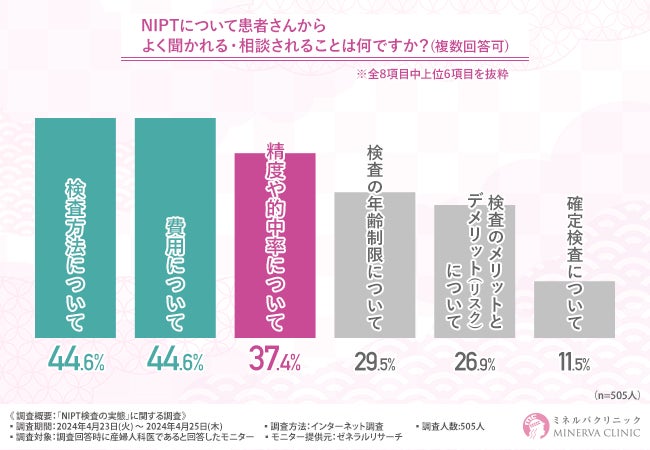 「NIPTについて患者さんからよく聞かれる・相談されることは何ですか?(複数回答可)」と質問したところ、『検査方法について(44.6%)』と回答した方が最も多く、『費用について(44.6%)』『精度や的中率について(37.4%)』と続きました。