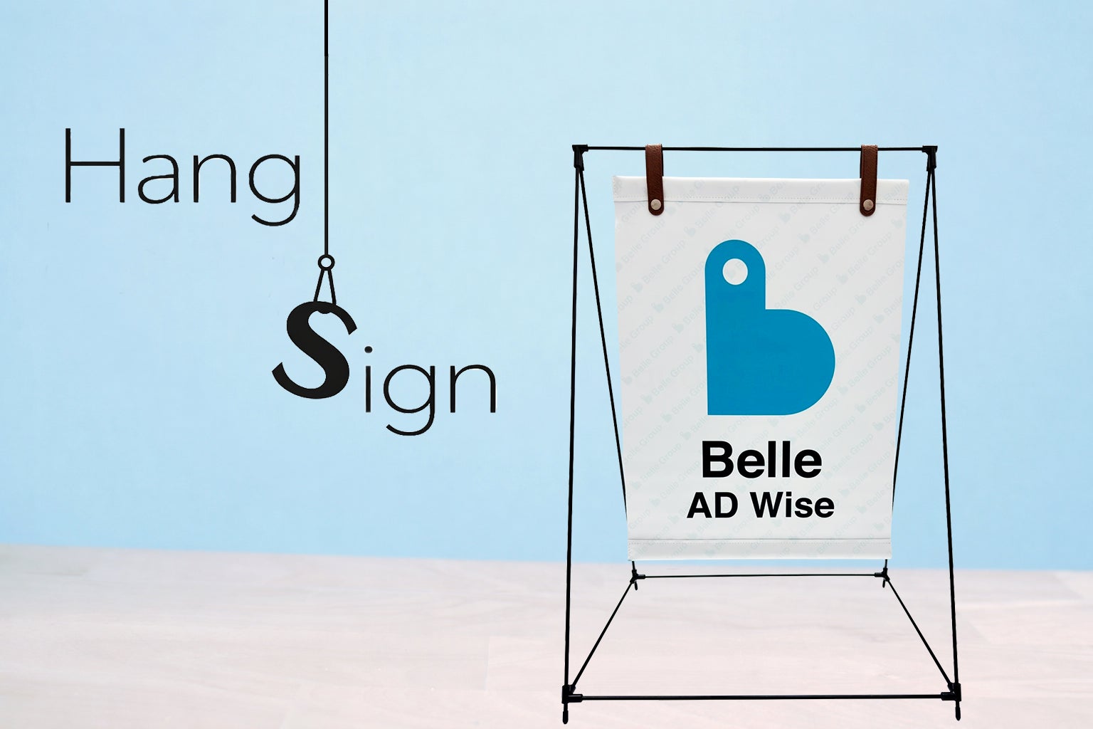 【ハングサイン】は、A型看板のような形状で使用できる、今までにない珍しいタイプのバナースタンドです。