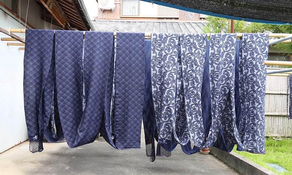 手糊を落とすため、ぬるま湯に浸けることで布は収縮し、よりしなやかになります。そして水洗いの後、竿にかけて天日でじっくり乾燥させることで仕上げとなります。竿にかけられた布が光を浴びてゆらゆらと自然の風にたなびく様子には、多くの工程と人の手をかけてつくられた味わい深い時間がながれます。