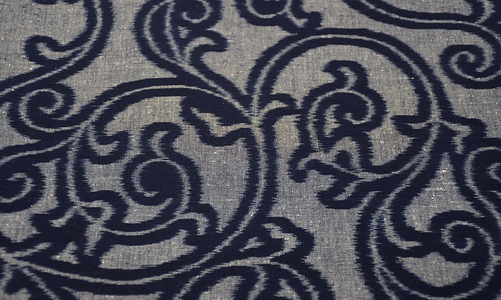 「唐草永寿」池田を代表する柄のひとつです。この唐草は、植物の葉、茎、ツルが絡み合っている様子を描いています。柄表現のための括りが非常に多く通常の緯絣よりも手間のかかる難しい柄の一つです。