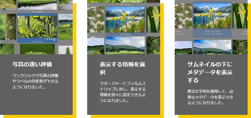マネージャーモジュールで写真をブラウズする際のプレビューを大幅に調整することができるようになりました。背景色やレーティングラベル、メタデータの直接表示やプレビュー画像下に表示するなど、さまざまな表示方法をディスプレイコンフィギュレーターで簡単にカスタマイズできます。