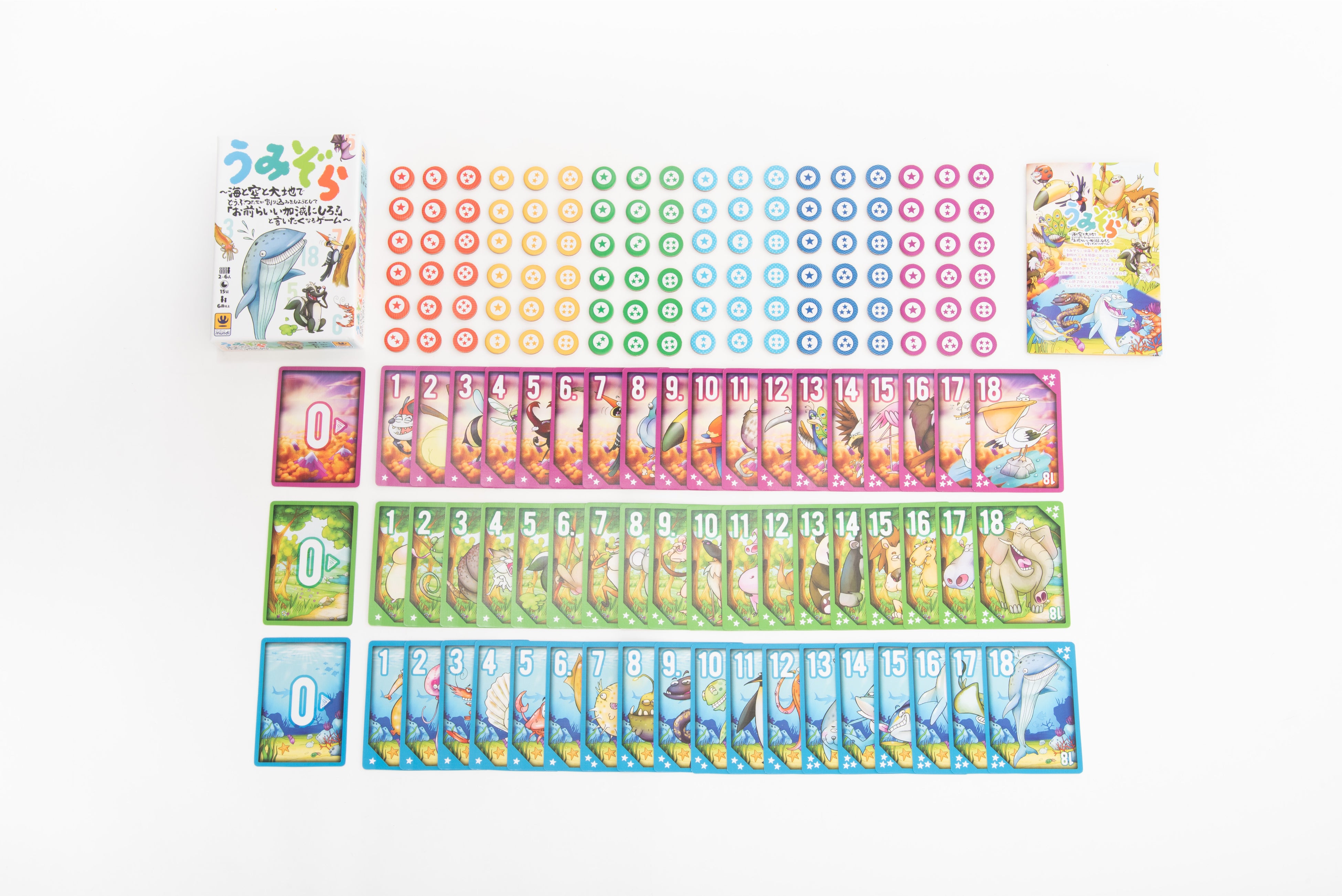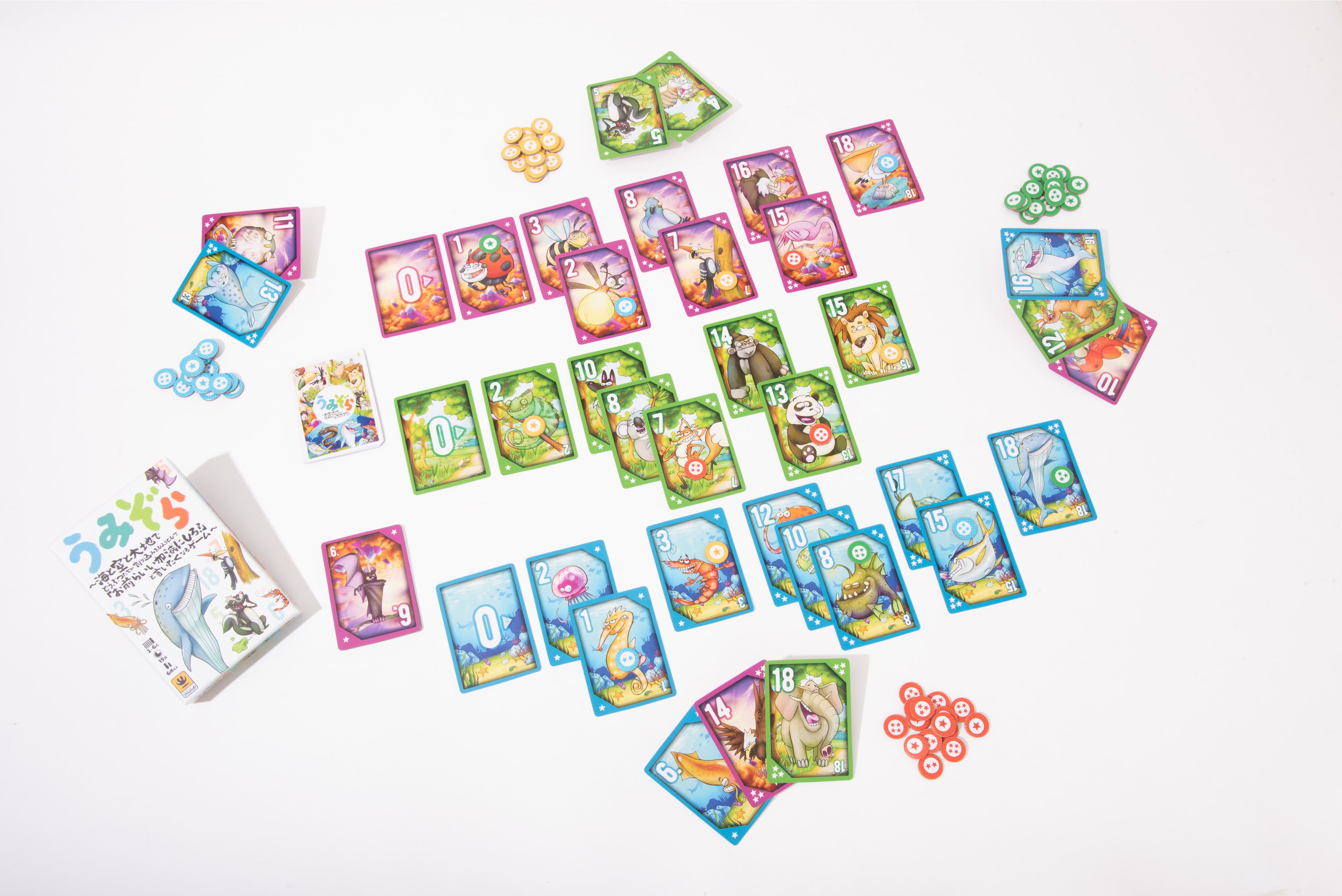 『うみぞら ~海と空と大地でどうぶつたちが割り込みをしようとして「お前らいい加減にしろ!」と言いたくなるゲーム~(以下『うみぞら』)』は海、空、大地の3つの列に、1~18の数字の書かれた『どうぶつカード』を順番に出し合うカードゲーム。スキあらばワリコミで得点を奪ってくる動物にイラッときたら、こちらもワリコミして奪い返そう!