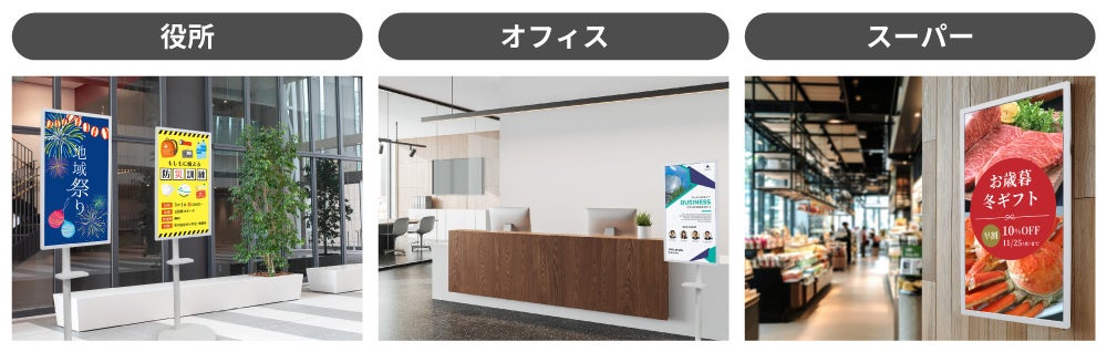 紙のポスターのような手軽さと省エネ性能を両立した、次世代の電子ポスターサイネージです。高精細なフルカラー表示と薄型・軽量設計を活かし、公共施設や商業施設、ホテル、ショールーム、飲食店など、さまざまな屋内空間に幅広く活用いただけます。