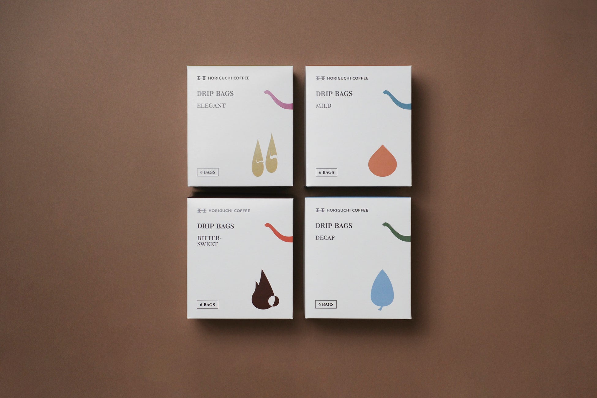 これまでの堀口珈琲の世界観を継承しつつ、テーブルに置いておきたくなるような軽やかさを感じるデザインを目指しました。共通のモチーフ“ドリップポット”と“水滴”を配し、形状・色彩を変えることで4つの味わいを表しています。