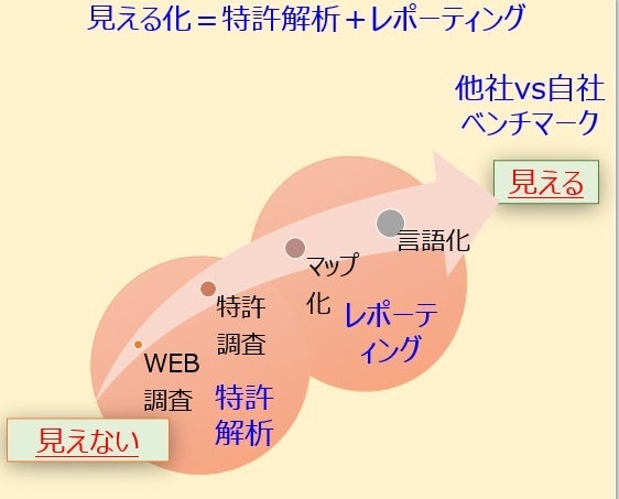・特長は、「早い」・「深い」・「伝わる」見える化する特許解析レポーティングを行うことです。