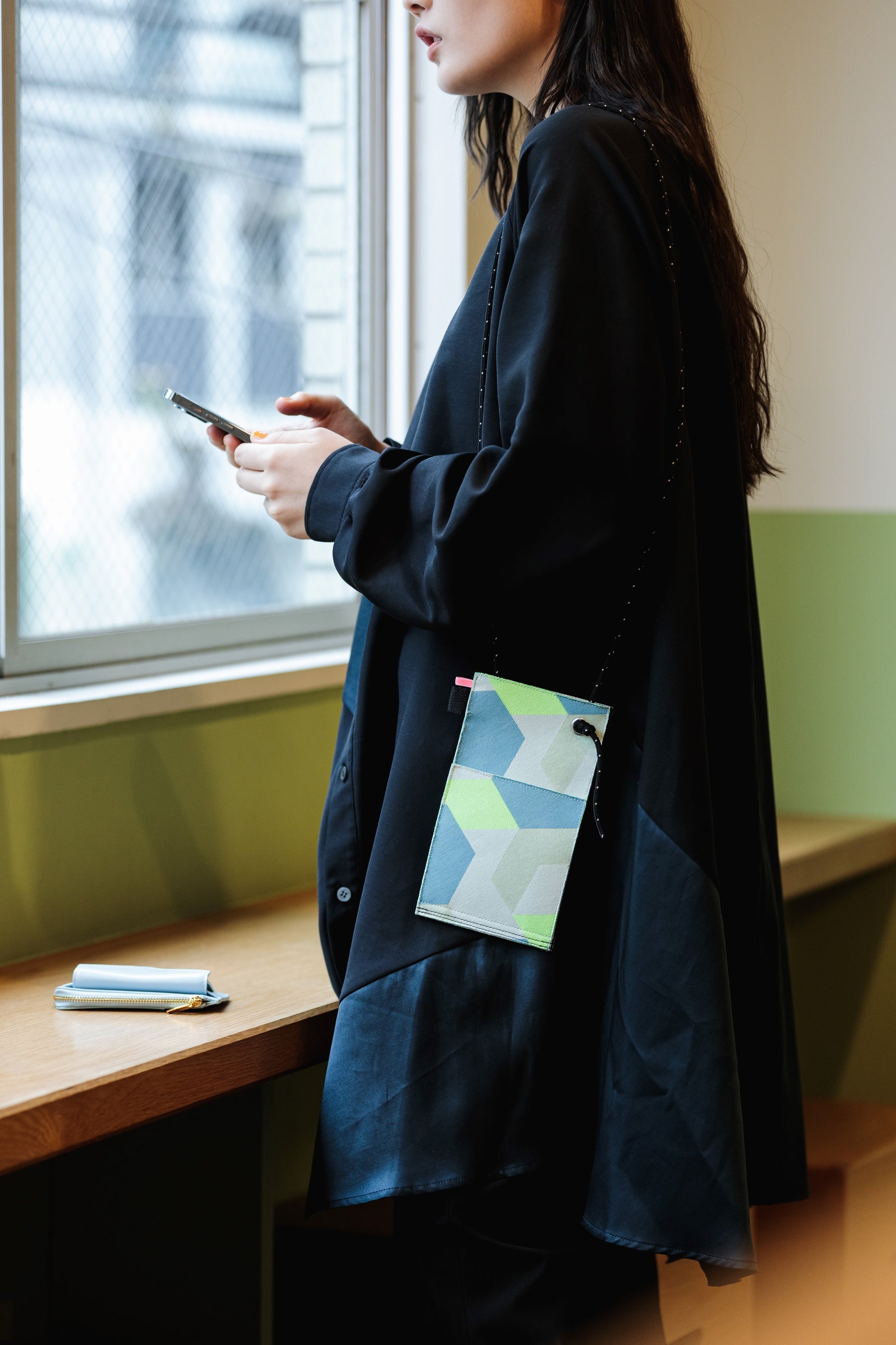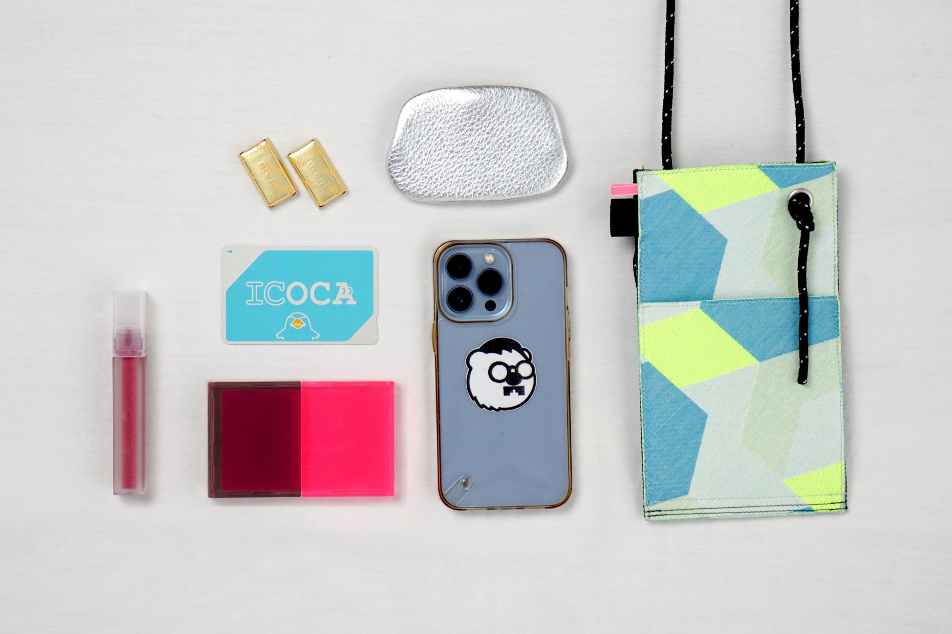 ちょっとしたお出かけに便利なショルダーポーチ。スマートフォンやICカードなどの普段なら洋服のポケットに収納するようなモノを入れるのにぴったりのサイズ感となっております。一見、薄く見えますがモノを収納すると膨らむようにサイドにマチが付いていたり表面にポケットが付いているので、スマートフォンと一緒に名刺入れや小銭入れなども収納が可能です。肩紐は結び目で長さの調整が可能で、リフレクターが入っており暗闇で光る仕様となっております。( 販売価格 ¥7,000+税 )
