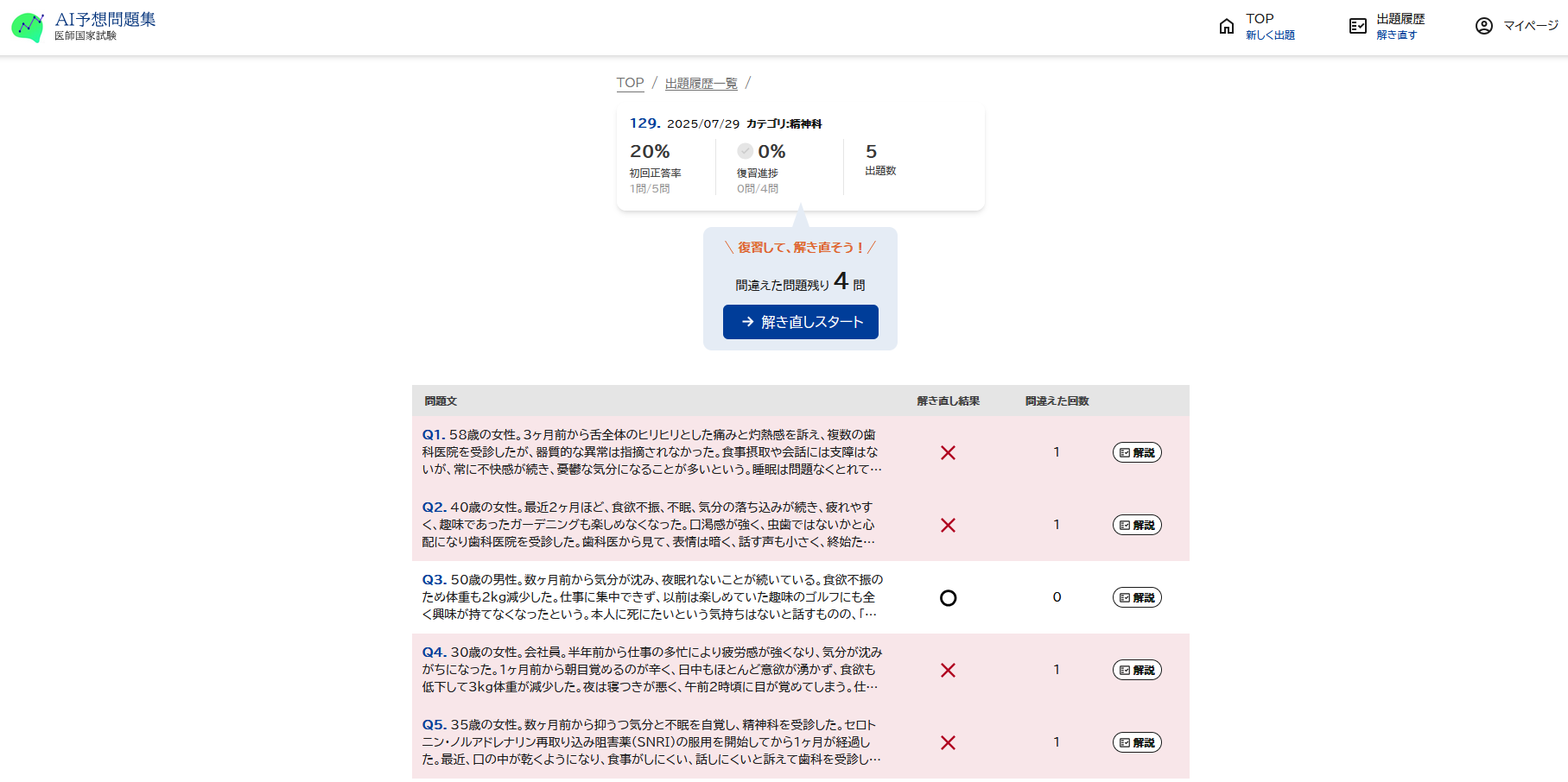 できるまで徹底復習 出題された問題はすべて保存されます。 間違えた問題は後から何度でも復習可能です。