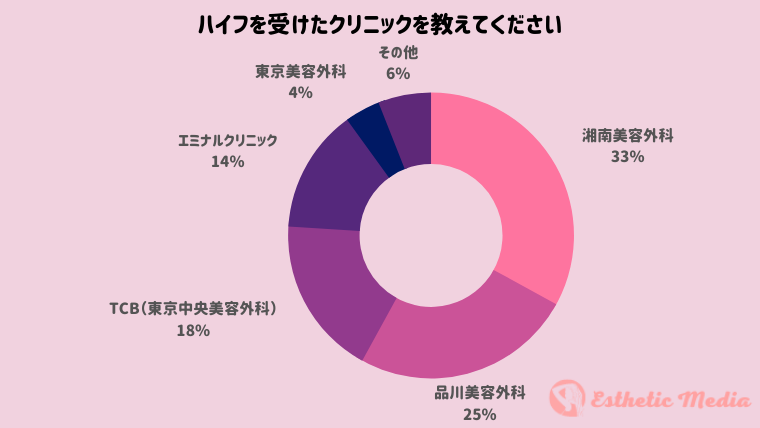 ・ハイフを受けた人が多いクリニックは「1位:湘南美容外科(33%)」「2位:品川美容外科(25%)」「3位:TCB(東京中央美容外科)(18%)」となりました。