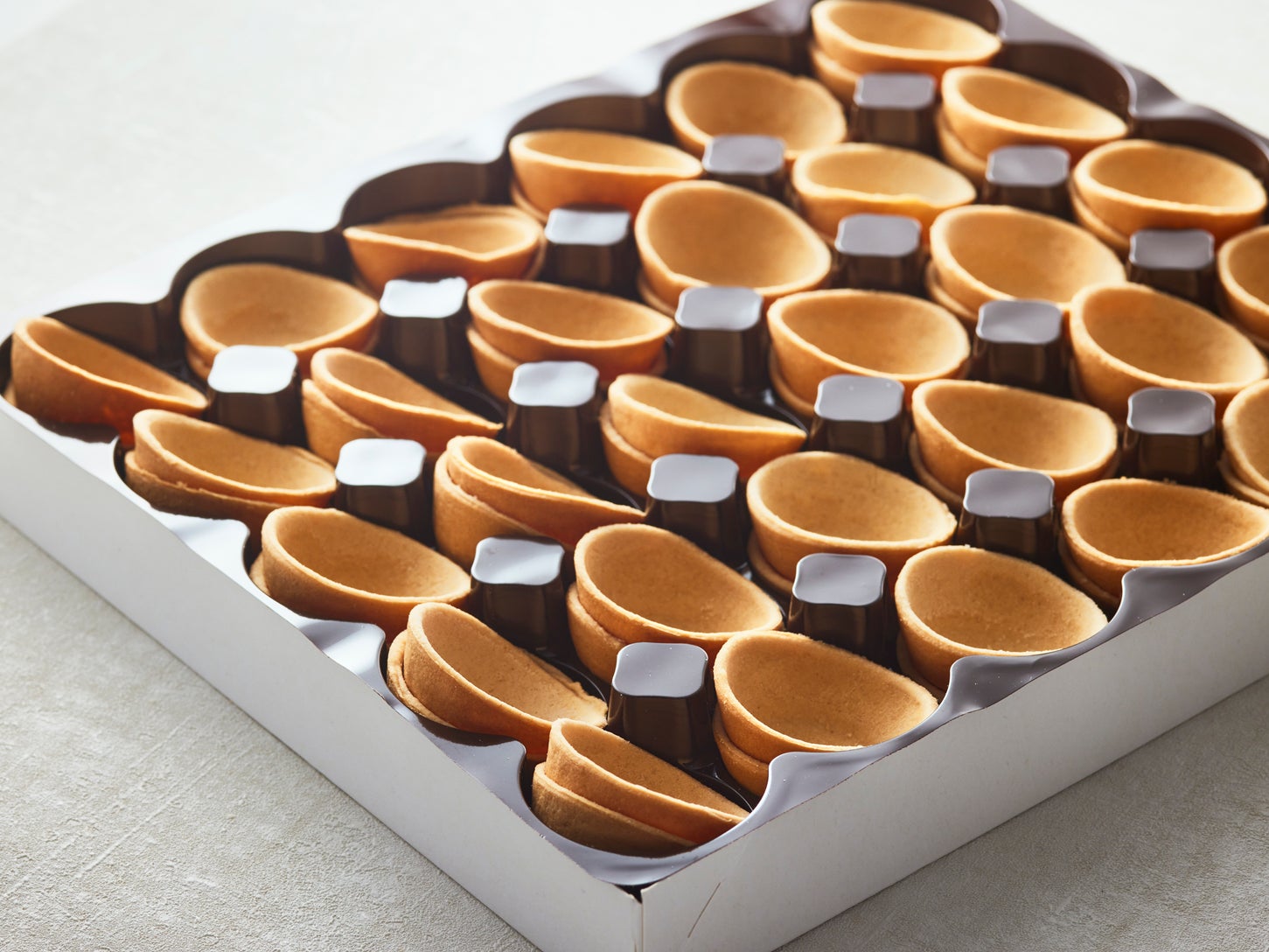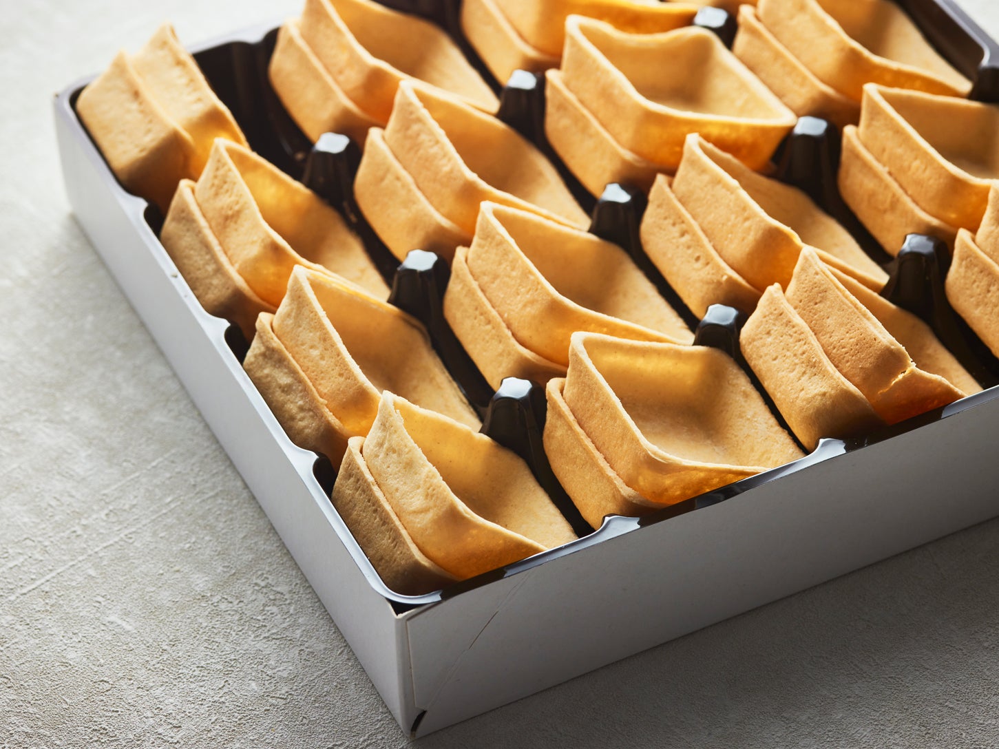 FOOD N’JOYのタルトシェルは、手作業で丁寧に製造されており、薄くてサクサクとした食感が特徴です。プレーンな風味でスイーツにも料理にも調和します。丸型のCHはニュートラル、ゴールド、フーシャ、オレンジ、ブラック、ピンク、グリーンの7色展開、スクエア型のQUATRAはニュートラルの1色展開で、カラフルな色合いでビュッフェやバンケットを華やかに彩ります。常温で保管でき、フィリングを充填した後に冷凍・解凍ができるので、仕込み作業の効率化が図れます。また、リベイクすることで焼きたてのようなクリスピーな食感が得られます。