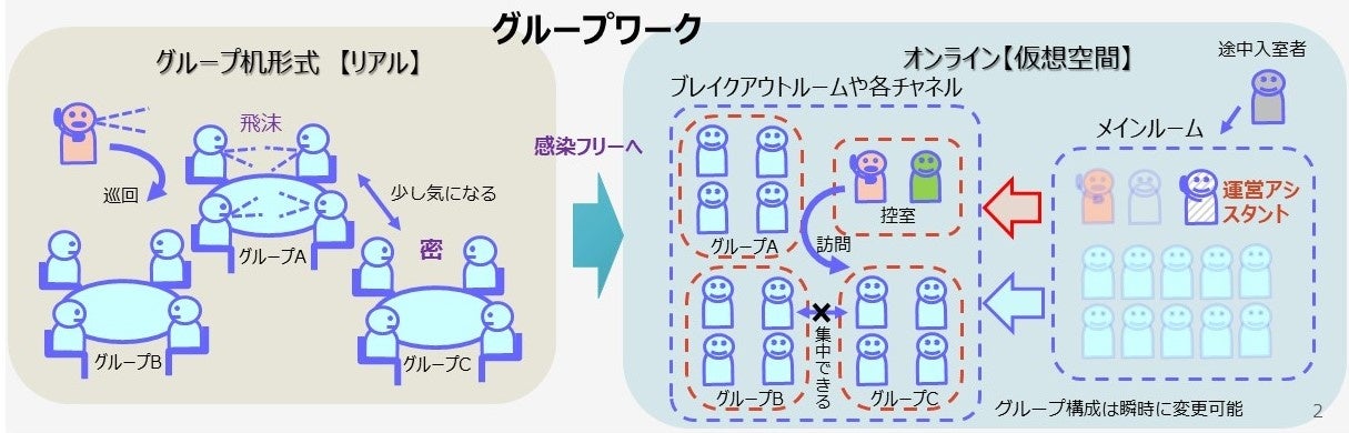 オンライン研修の大きな特徴は、ブレイクアウトルームやチャネル機能を利用してグループワークを行うことが出来る所です。リアルの場合はグループ毎に机を配置してメンバーが集まって課題を取り組みますが、オンラインはグループ毎に仮想的な小部屋を用意することで同じようにグループワークを実施することが出来ます。また、ブレイクアウトルームは音声やチャットが他の部屋と閉ざされているため、グル-プが課題に集中することも出来ます。その小部屋の数やチャネルの案内、受講メンバーの割り当て、メインへの戻り時間などの設定を運営アシスタントが行います。また、新たな参加者の入退室やブレイクアウトルームとの連絡を担うことも可能です。