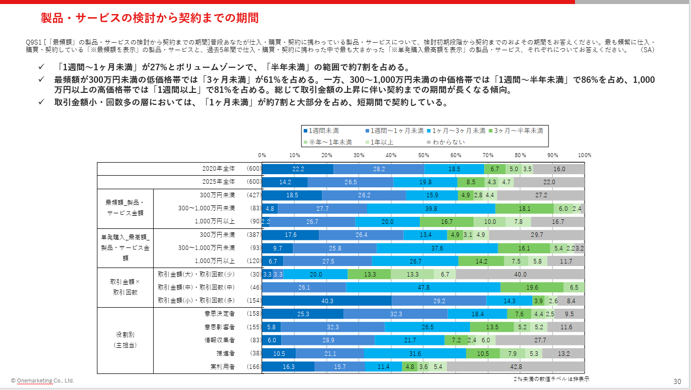 また、高価格帯取引の54%が検討から契約まで「半年以上」を要しており、購入までの期間が長期化していることがわかりました。