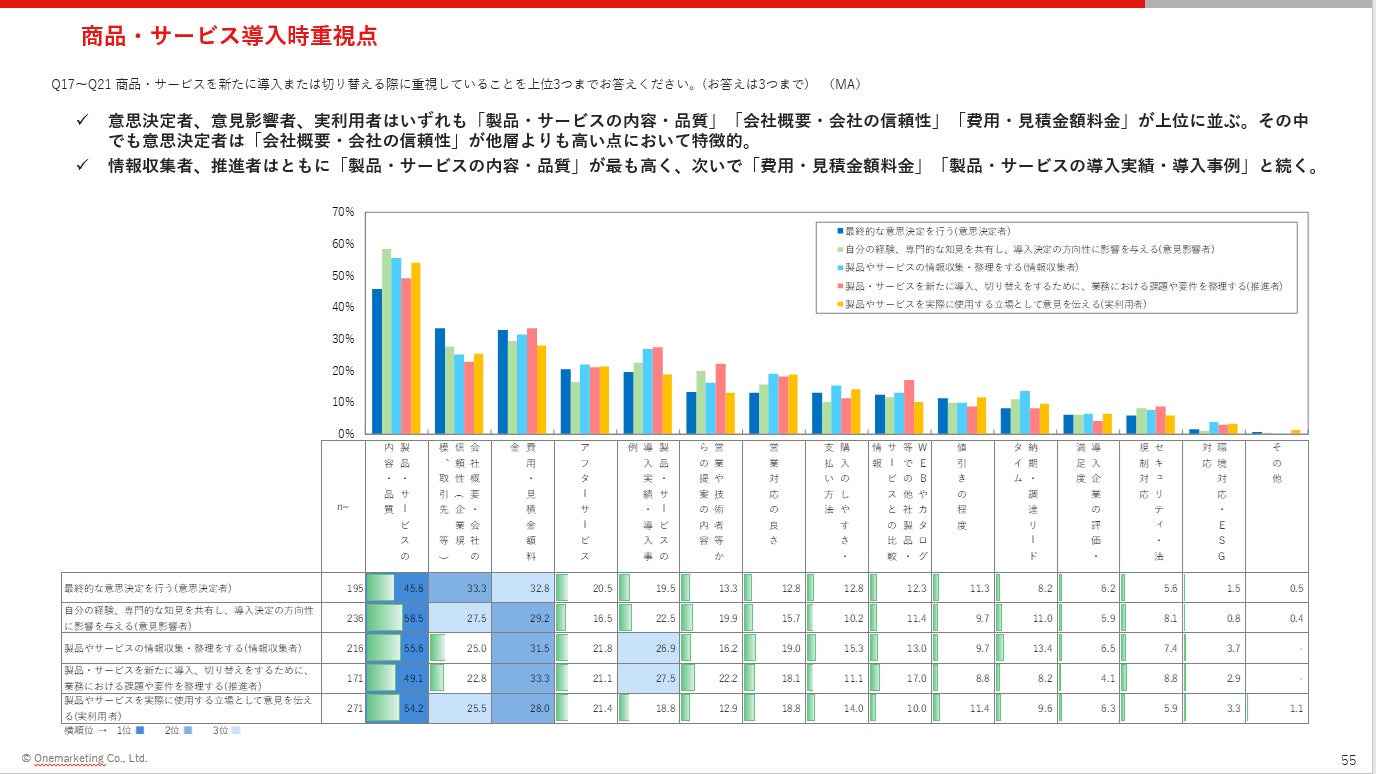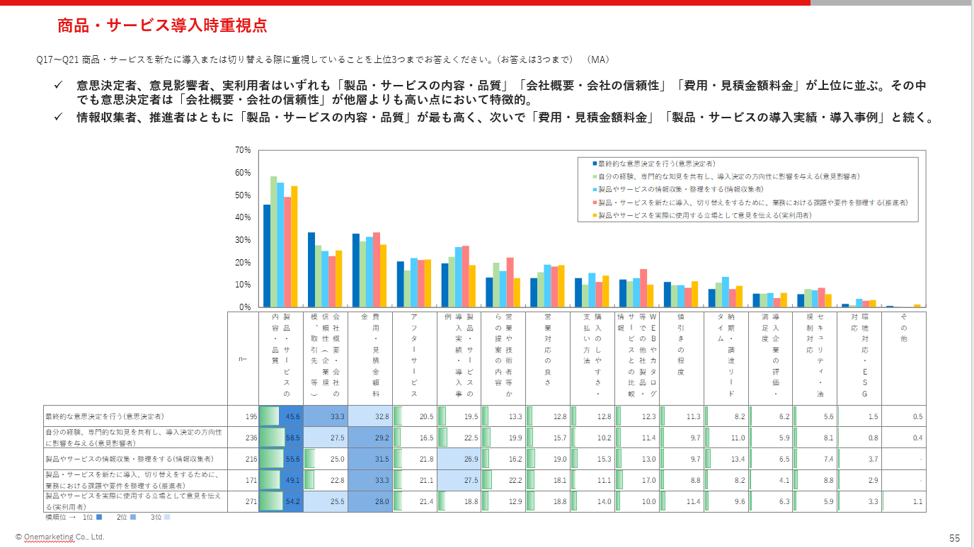 一方で意思決定者層は、「導入企業の満足度」「支払い条件」「サポート品質」などを重視。