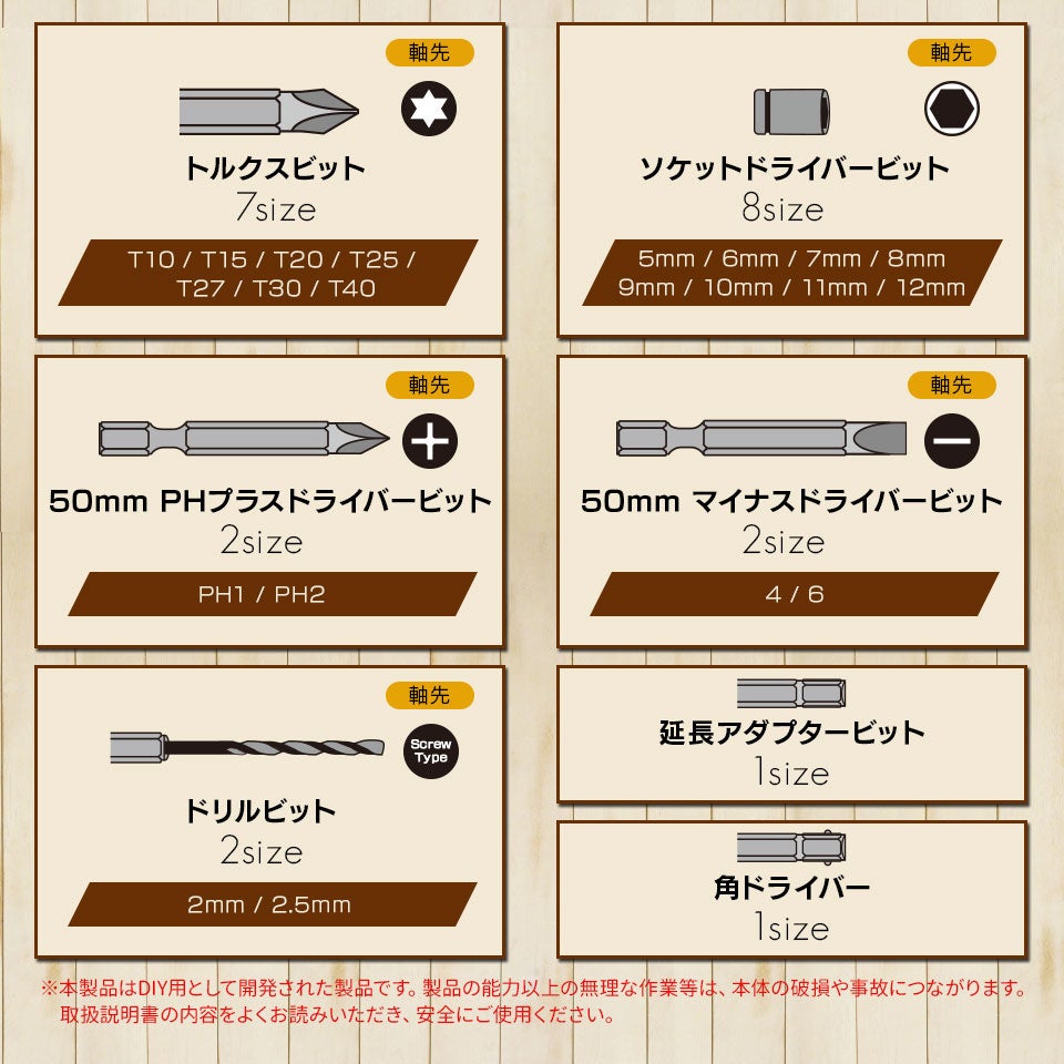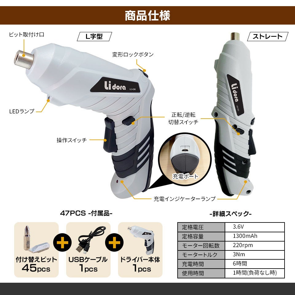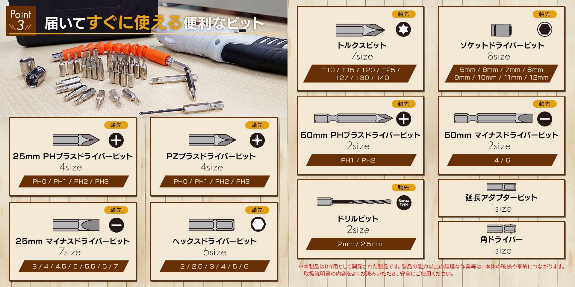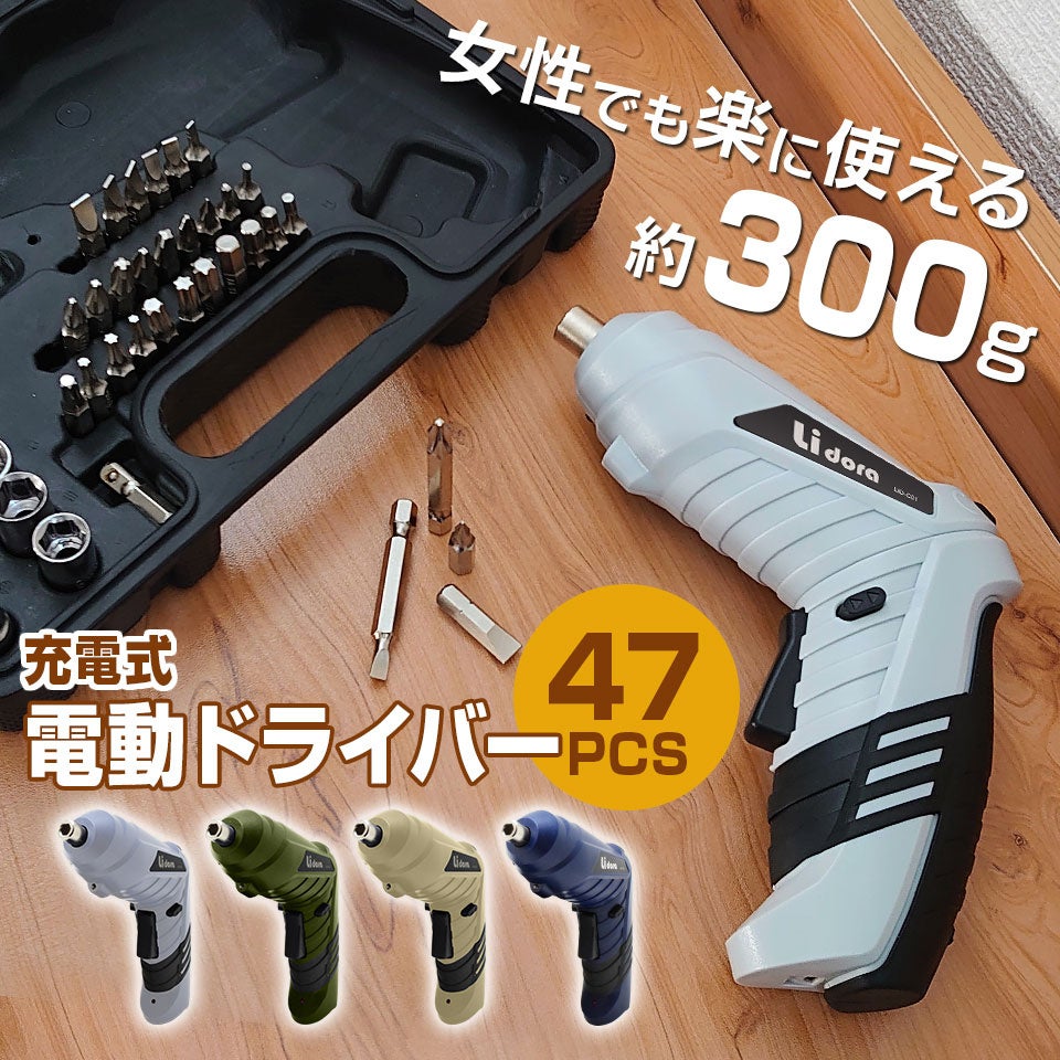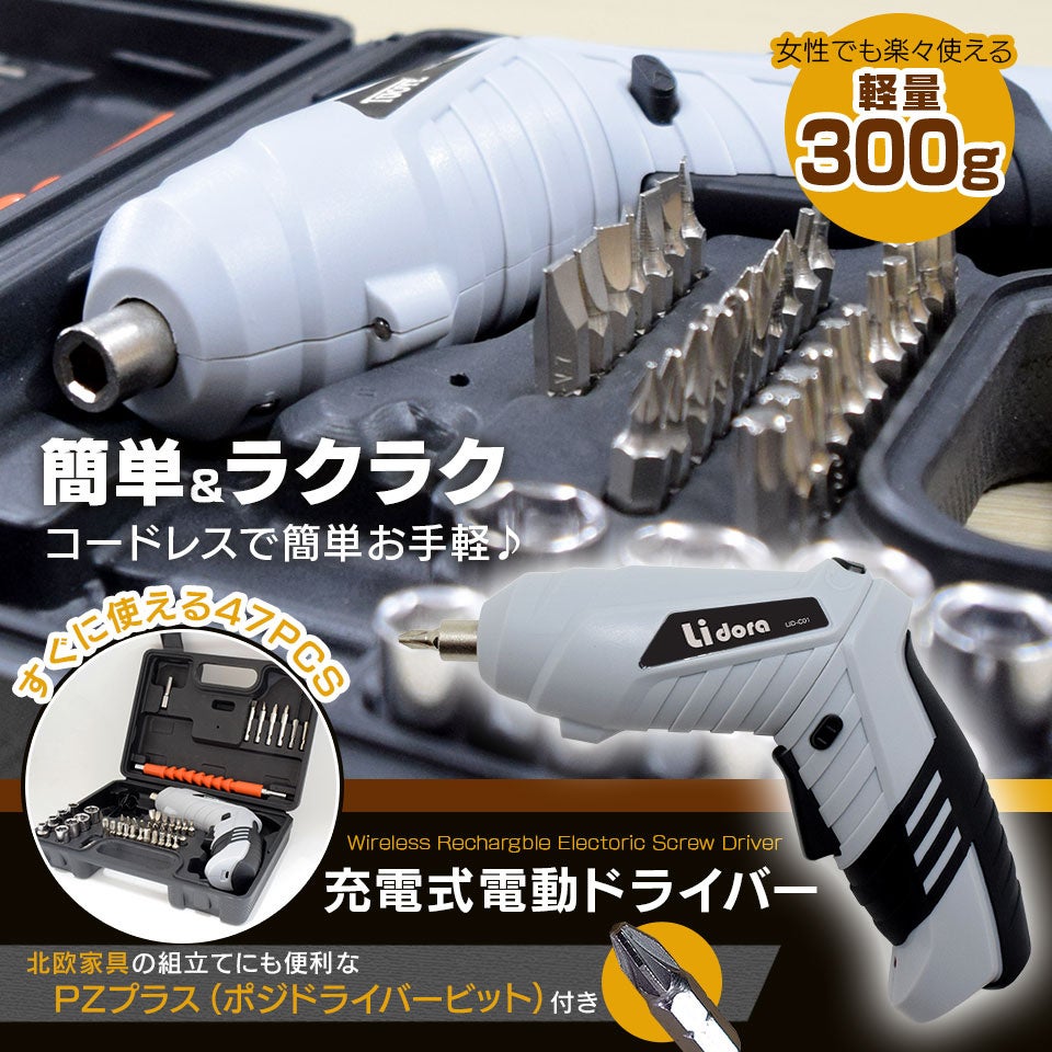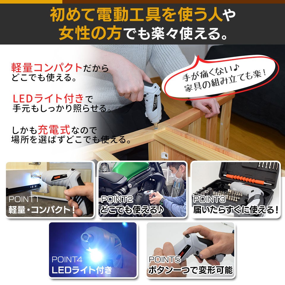 『あったら便利』『買い求めやすいお値段』『やっぱり電動が楽々』『コンパクト&軽量』『充電式だからどこにでも持ち運び』『アタッチメントが豊富』『変形式2Way形状』『47点セット』