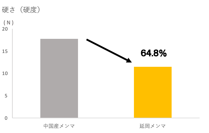 「延岡メンマ」の硬度は11.50Nであり、中国産メンマの17.76Nに対し、約64.8%であることがわかりました。硬度は「硬さ」を表します。孟宗竹が原料の延岡メンマ(国産メンマ)は、麻竹を原料とする中国産メンマと比べ、柔らかいことが特徴といえます。