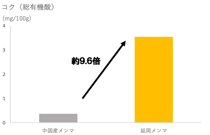 「延岡メンマ」の総有機酸含有量は3.55mg/100gであり、中国産メンマの0.37mg/100gに対し、約9.6倍の量が含まれていることがわかりました。総有機酸は、食べ物のおいしさを引き出す「コク」を感じる成分です。したがって、孟宗竹が原料の延岡メンマ(国産メンマ)は、麻竹を原料とする中国産メンマと比べ、約9.6倍のコクがあるといえます。
