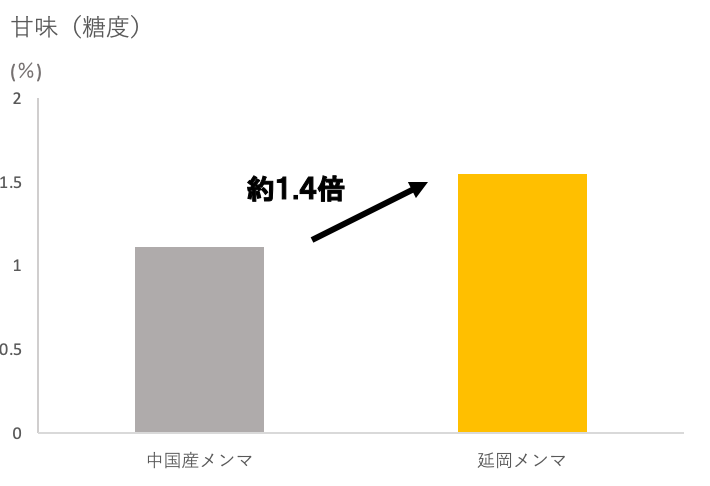 「延岡メンマ」の糖度は1.55%であり、中国産メンマの1.11%に対し、約1.4倍であることがわかりました。糖度は食べ物の「甘味」を表します。したがって、孟宗竹が原料の延岡メンマ(国産メンマ)は、麻竹を原料とする中国産メンマと比べ、約1.4倍の甘味があるといえます。