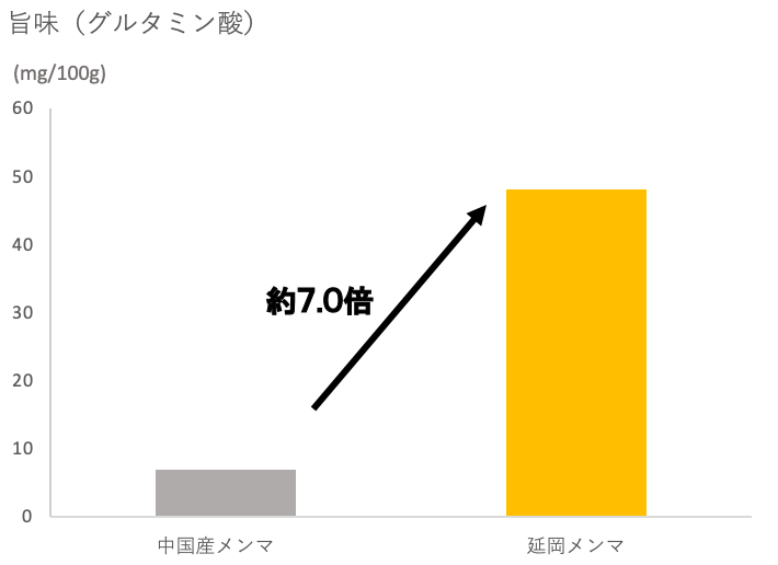 「延岡メンマ」のグルタミン酸含有量は48.10mg/100gであり、中国産メンマの6.85mg/100gに対し、約7.0倍の量が含まれていることがわかりました。グルタミン酸はアミノ酸の一つであり、旨味物質の代表的存在です。したがって、孟宗竹が原料の延岡メンマ(国産メンマ)は、麻竹を原料とする中国産メンマと比べ、約7.0倍の旨味があるといえます。