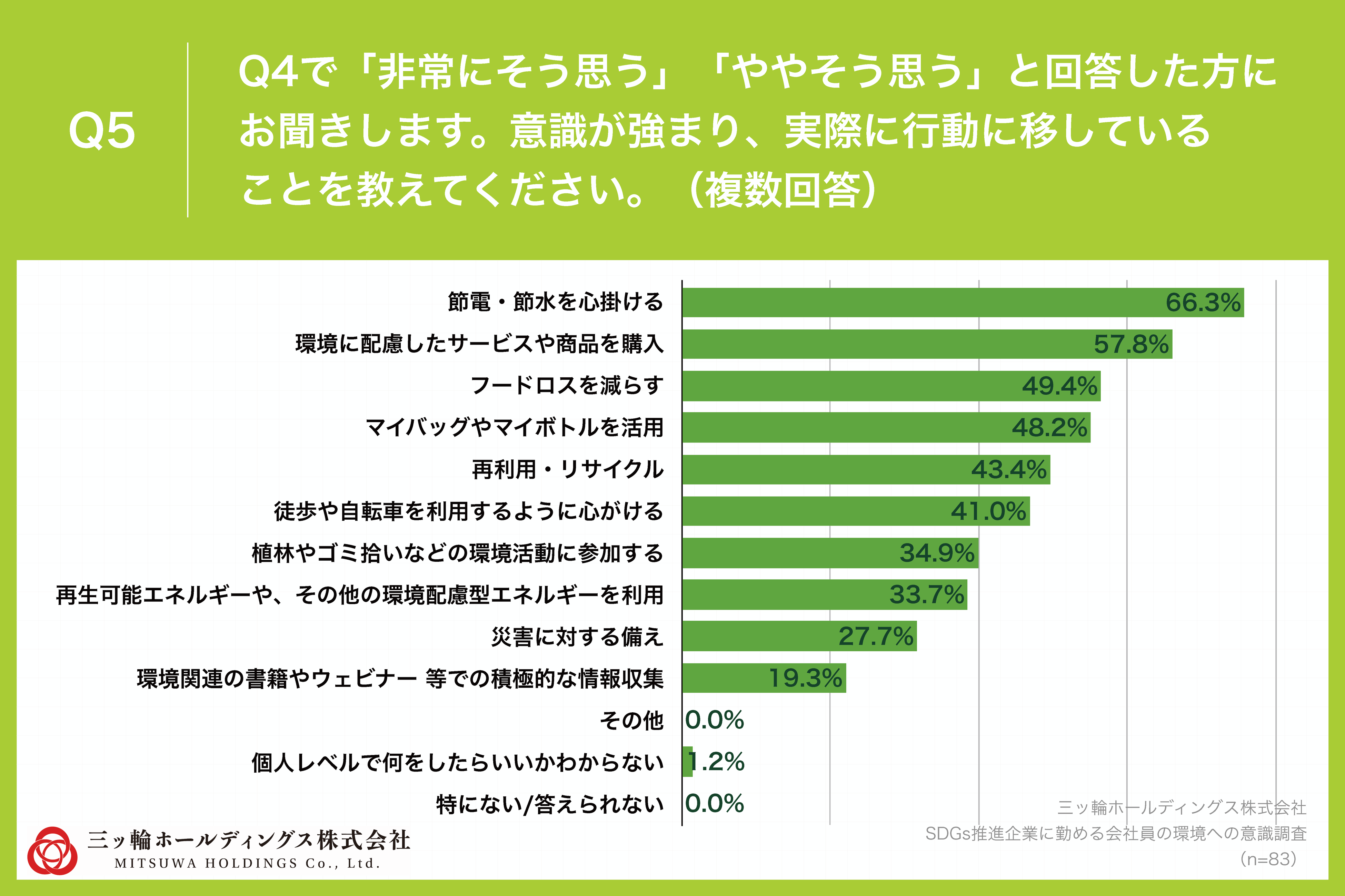 Q4で「非常にそう思う」「ややそう思う」と回答した方に、「Q5.意識が強まり、実際に行動に移していることを教えてください。(複数回答)」(n=83)と質問したところ、「節電・節水を心掛ける」が66.3%、「環境に配慮したサービスや商品を購入」が57.8%、「フードロスを減らす」が49.4%という回答となりました。