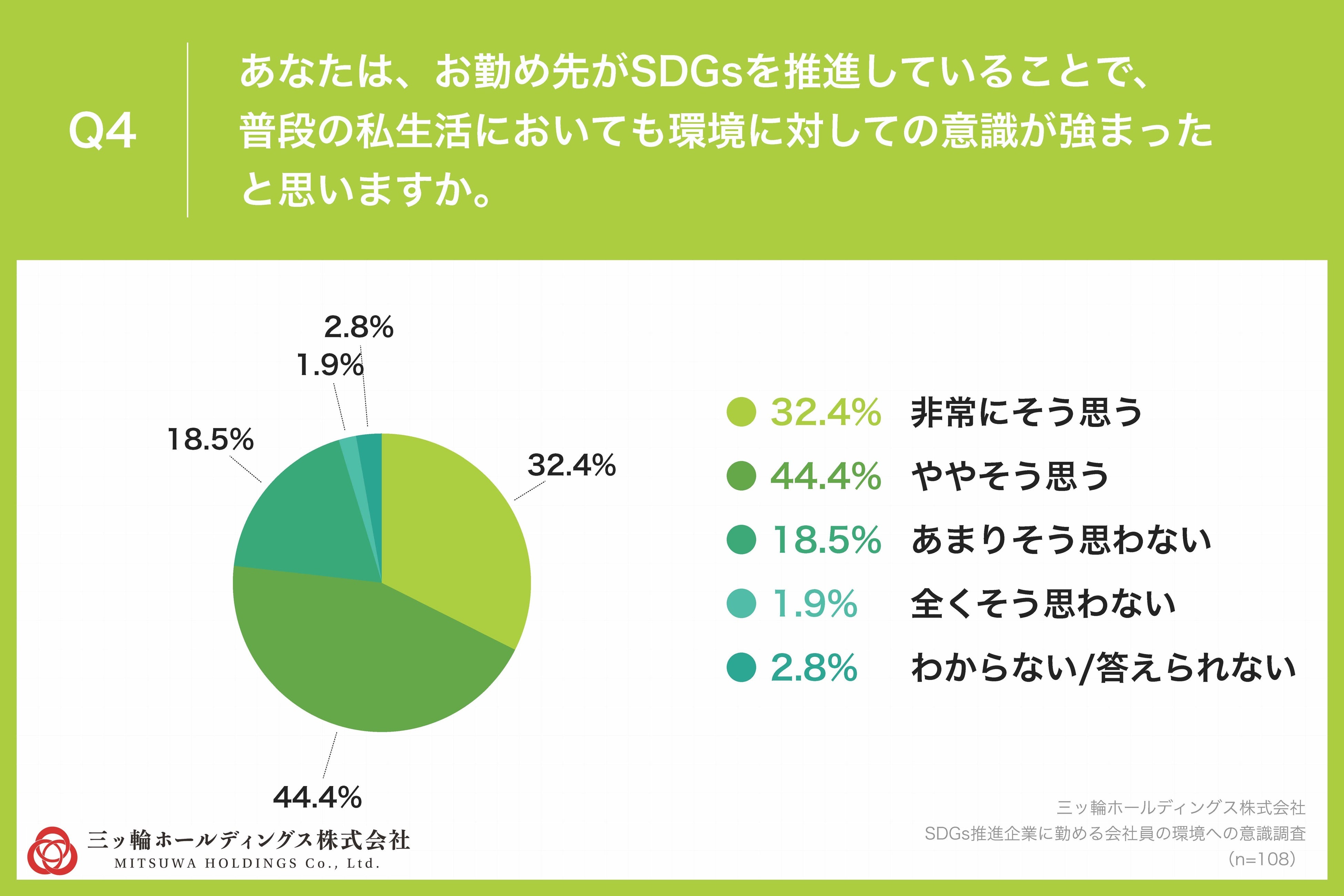 「Q4.あなたは、お勤め先がSDGsを推進していることで、普段の私生活においても環境に対しての意識が強まったと思いますか。」(n=108)と質問したところ、「非常にそう思う」が32.4%、「ややそう思う」が44.4%という回答となりました。
