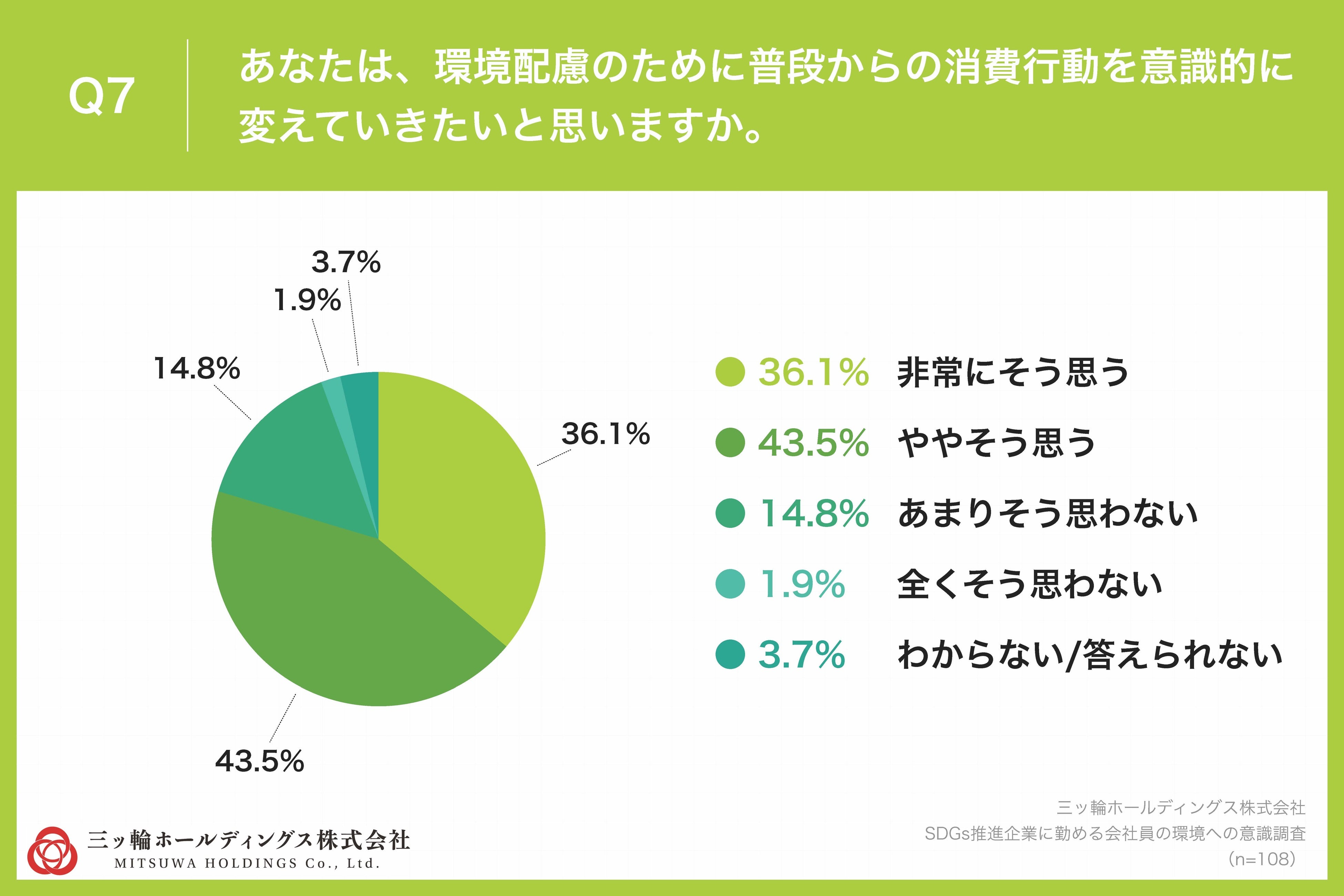「Q7.あなたは、環境配慮のために普段からの消費行動を意識的に変えていきたいと思いますか。」(n=108)と質問したところ、「非常にそう思う」が36.1%、「ややそう思う」が43.5%という回答となりました。