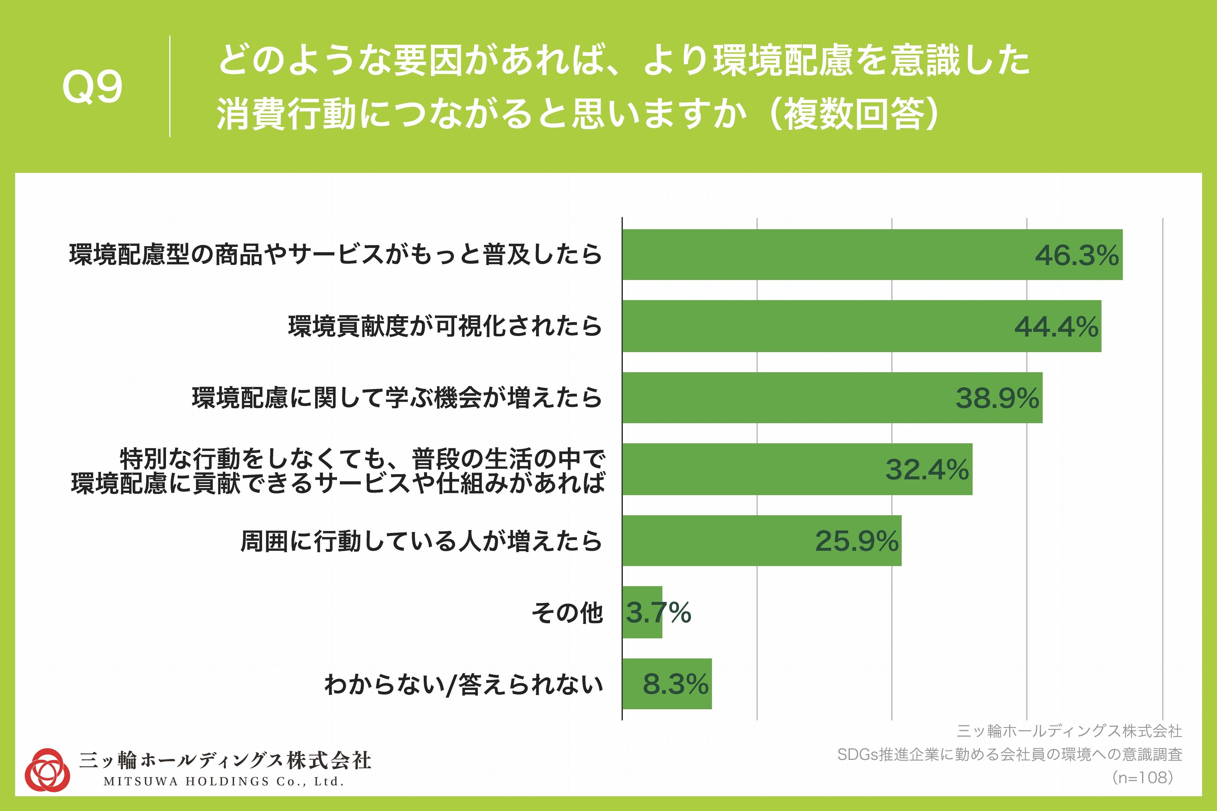 「Q9.どのような要因があれば、より環境配慮を意識した消費行動につながると思いますか(複数回答)」(n=108)と質問したところ、「環境配慮型の商品やサービスがもっと普及したら」が46.3%、「環境貢献度が可視化されたら」が44.4%、「環境配慮に関して学ぶ機会が増えたら」が38.9%という回答となりました。