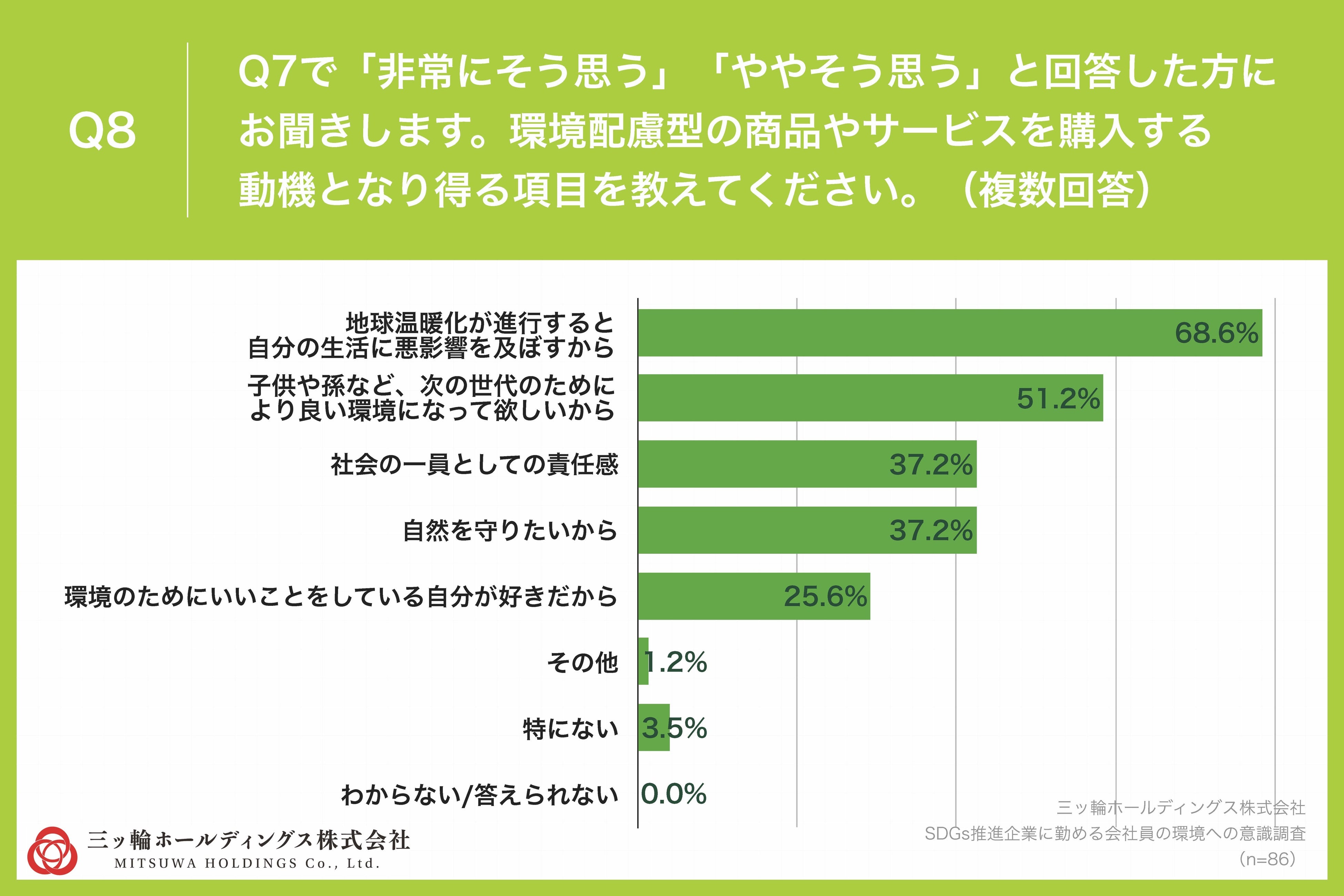 Q7で「非常にそう思う」「ややそう思う」と回答した方に、「Q8環境配慮型の商品やサービスを購入する動機となり得る項目を教えてください。(複数回答)」(n=86)と質問したところ、「地球温暖化が進行すると自分の生活に悪影響を及ぼすから」が68.6%、「子供や孫など、次の世代のためにより良い環境になって欲しいから」が51.2%という回答となりました。