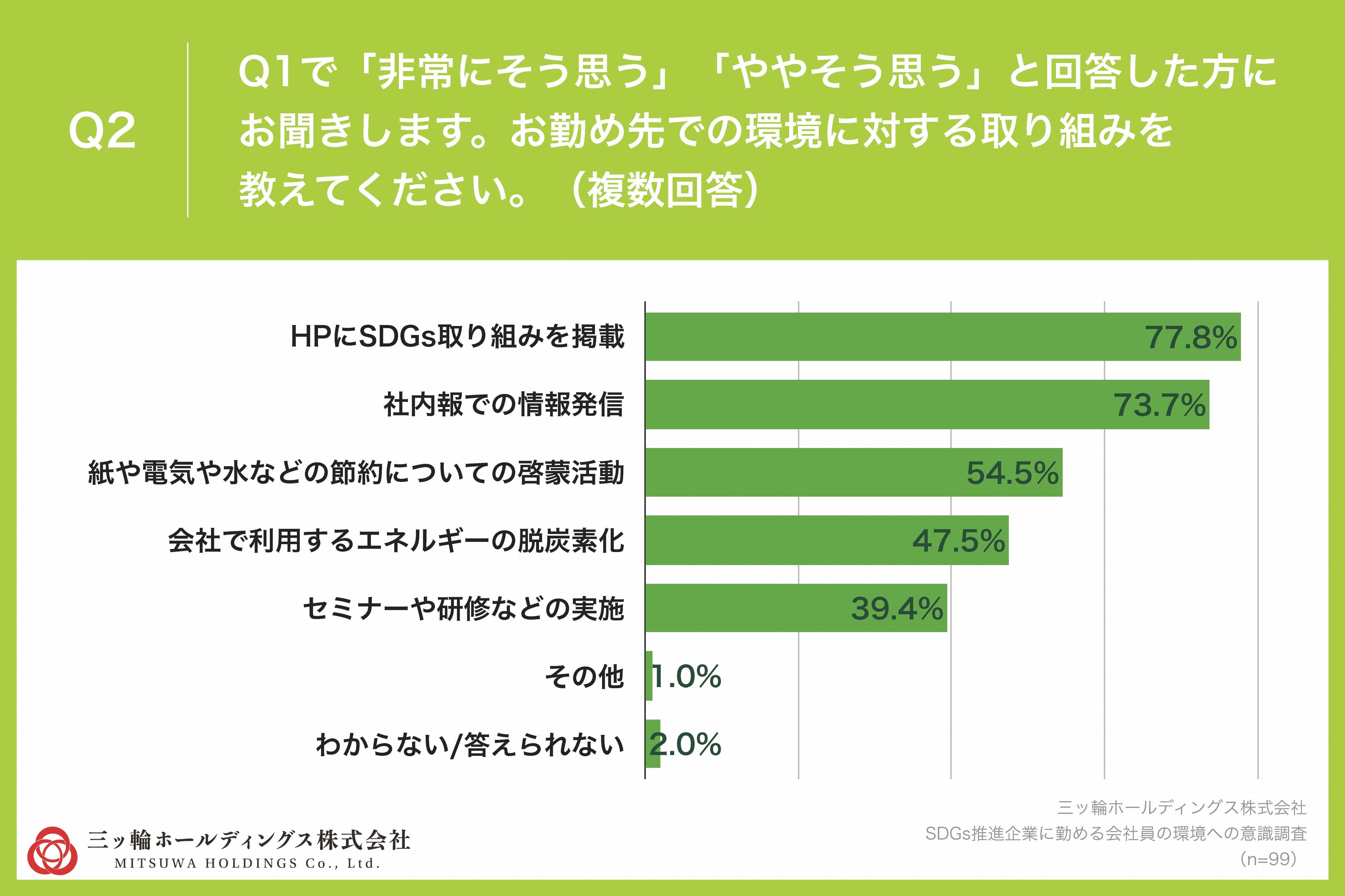 Q1で「非常にそう思う」「ややそう思う」と回答した方に、「Q2.お勤め先での環境に対する取り組みを教えてください。(複数回答)」(n=99)と質問したところ、「HPにSDGs取り組みを掲載」が77.8%、「社内報での情報発信」が73.7%、「紙や電気や水などの節約についての啓蒙活動」が54.5%という回答となりました。