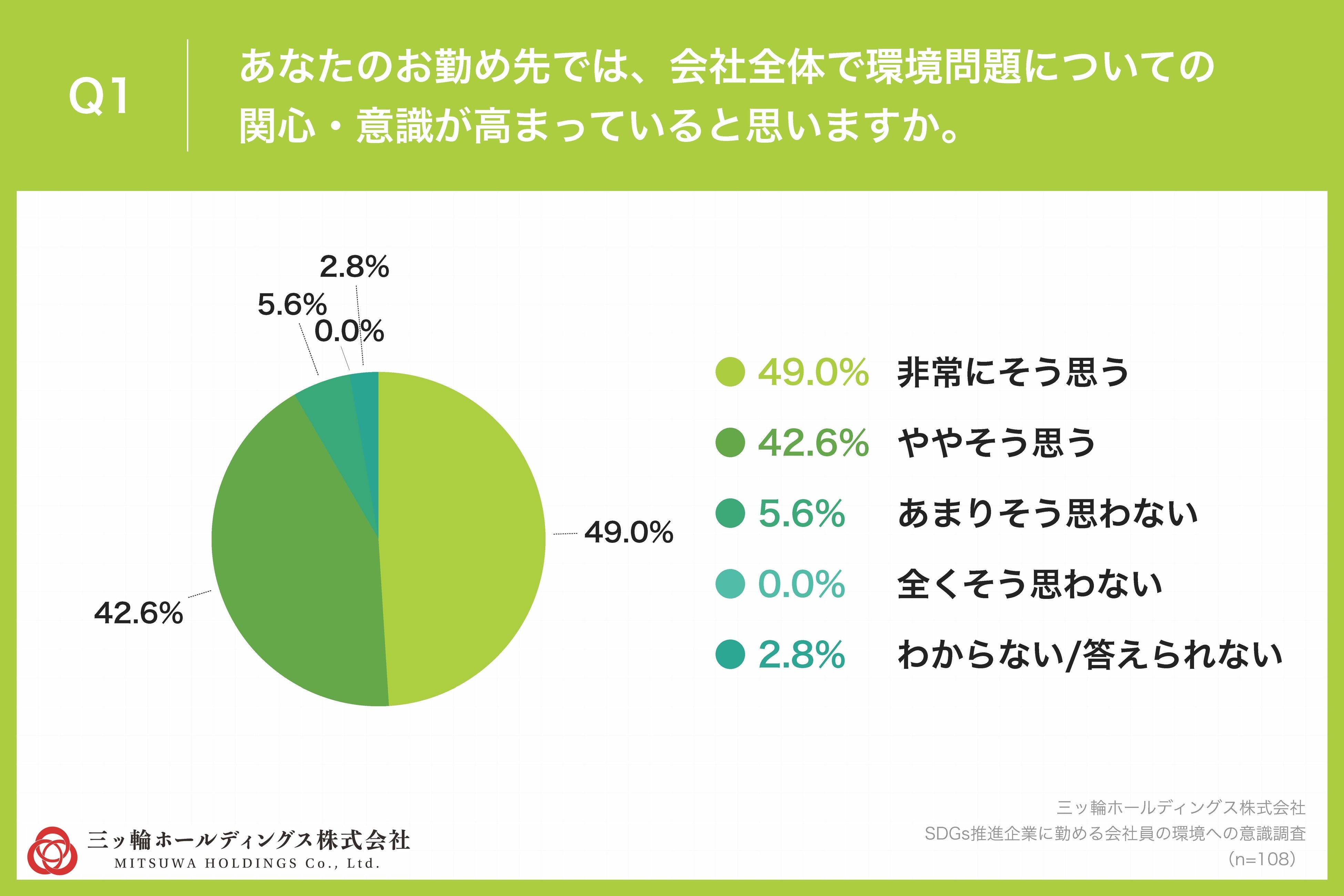 「Q1.あなたのお勤め先では、会社全体で環境問題についての関心・意識が高まっていると思いますか。」(n=108)と質問したところ、「非常にそう思う」が49.0%、「ややそう思う」が42.6%という回答となりました。