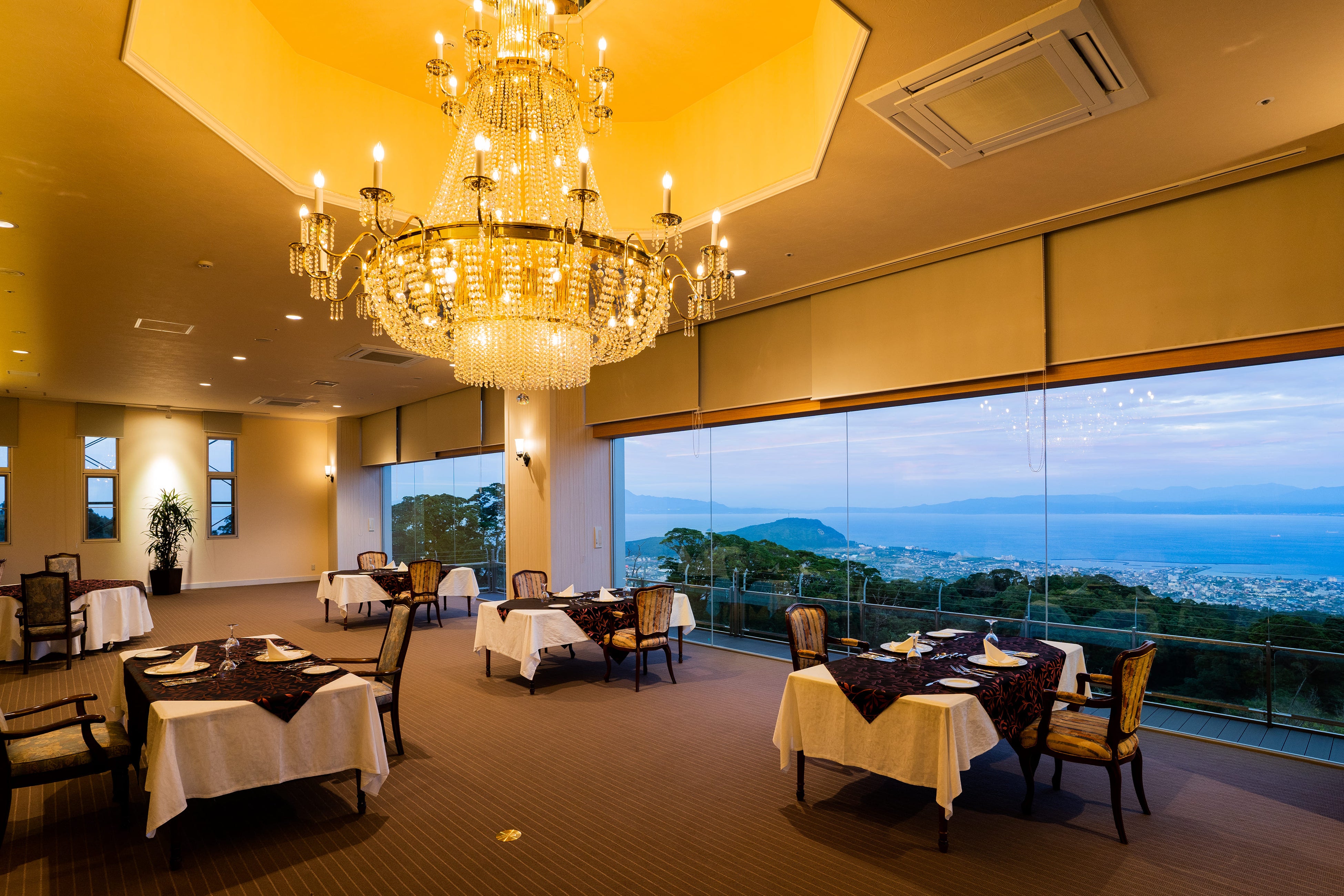 フランス語で"天空"という意味を持つレストラン「Céleste」。解放感溢れる空間に、グランドピアノときらびやかなシャンデリアが調和し、窓一面に広がる錦江湾の絶景をおさめます。