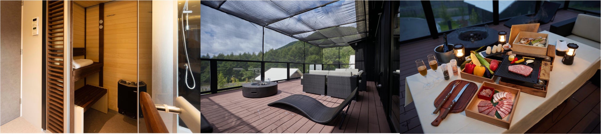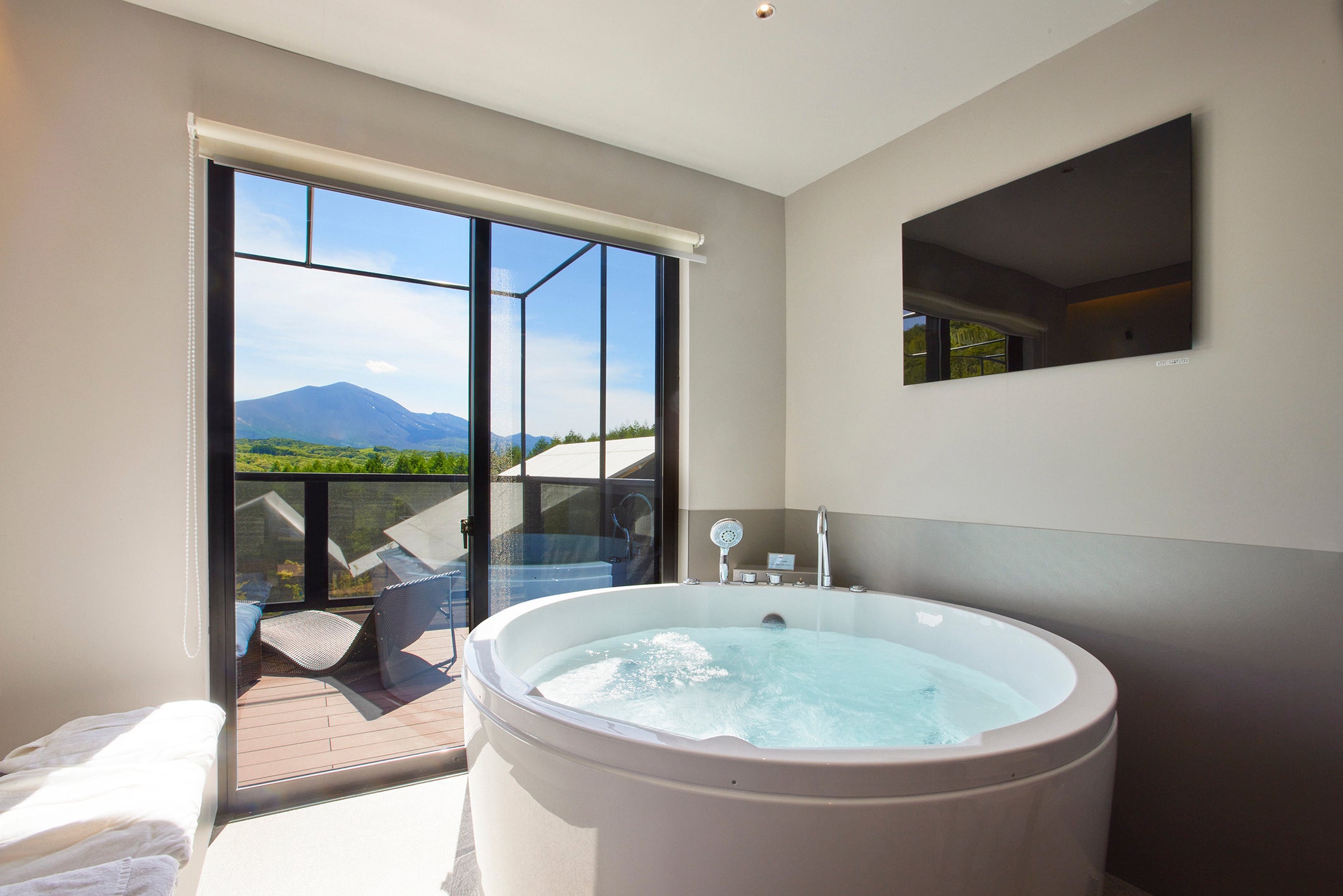 この度開始する新プランは、新緑と旅行、そしてゴルフも一緒に楽しんでいただく期間限定の特別プランです。まず1日目は、あさま空山望にチェックインし、客室のデッキテラスで新緑や浅間山ビューの絶景を眺めながら森林浴をしたり、バスタイムを楽しんだり、思い思いの優雅な旅行を堪能。