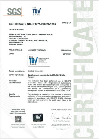 株式会社 日立情報通信エンジニアリング(以下、当社)は、「ISO/SAE 21434:2021 自動車-サイバーセキュリティエンジニアリング」の国際規格に準拠した開発プロセス認証をSGS-TÜV Saar GmbH*1より取得したことをお知らせいたします。