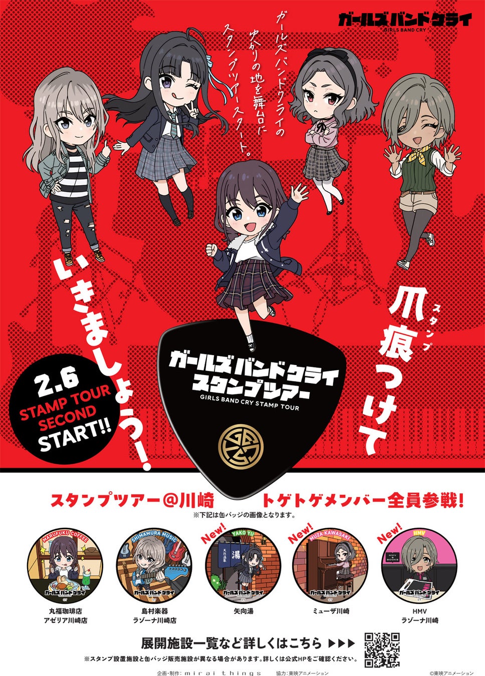 株式会社クオラス(本社:東京都品川区、代表取締役社長CEO:松下幸生)は、神奈川県川崎市を舞台とするオリジナルアニメ「ガールズバンドクライ」(製作:東映アニメーション)のスタンプツアー第2弾を2月6日(木)から開始致します。第2弾として川崎市内3箇所にスタンプを設置し、スタンプ用に描き下ろされたイラストの缶バッジを発売します。これにより、すでに開始している2箇所と合わせ、作品のメインキャラクター5名が勢揃い致します。