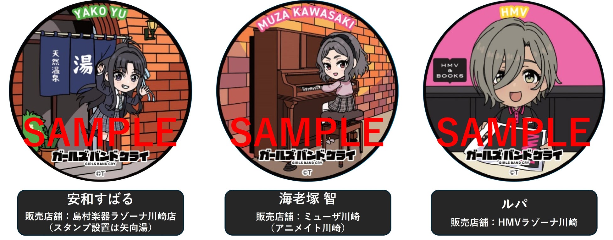 劇中に登場するガールズバンド「トゲナシトゲアリ」より、ドラムの安和すばる(設置場所:矢向湯)、キーボードの海老塚 智(設置場所:ミューザ川崎内 アニメイト川崎)、ベースのルパ(設置場所:HMVラゾーナ川崎)が登場!全て、劇中で所縁のある場所になっています。スタンプには、同店舗を背景とした各キャラクターが描かれています。第1弾の井芹仁菜(設置場所:丸福珈琲店 川崎アゼリア店)、河原木桃香(設置場所:島村楽器 ラゾーナ川崎店)に続き、この第2弾でトゲナシトゲアリのメンバー5人が集結します。尚、スタンプ設置店は今後も追加を予定しております。