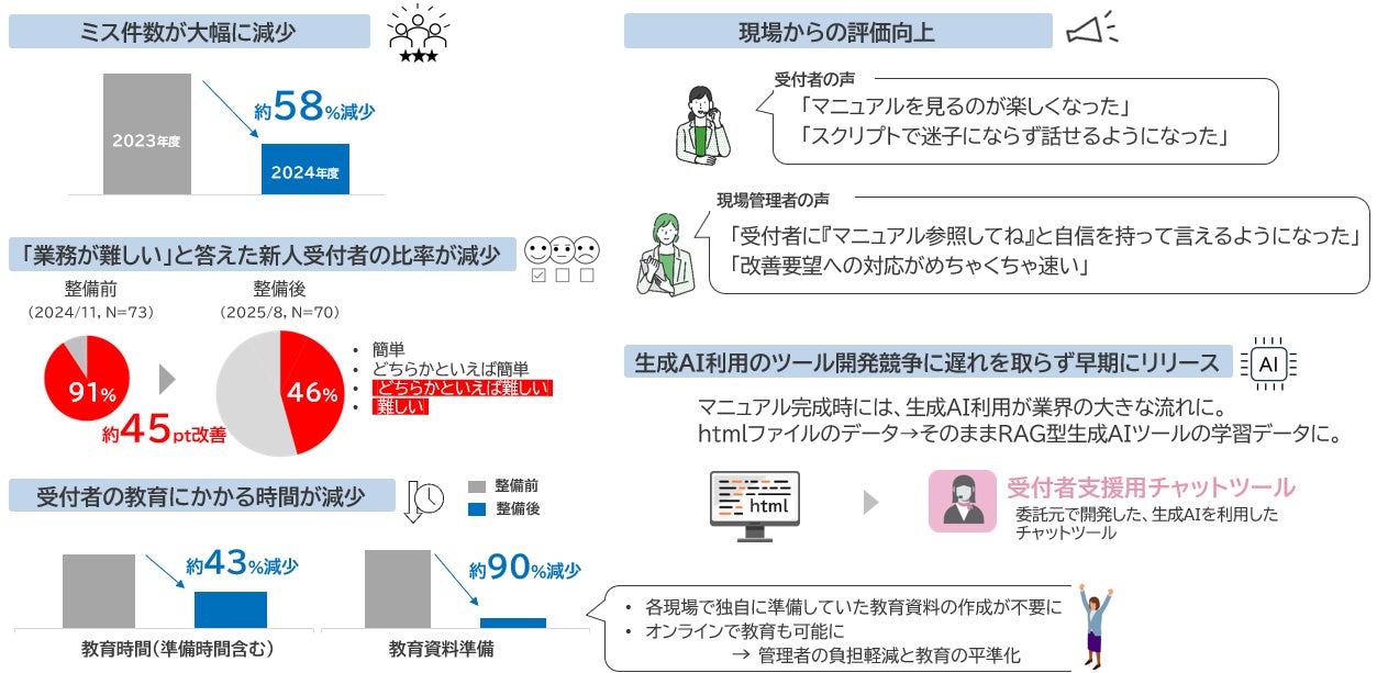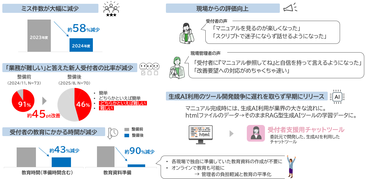 取組みによる成果として、マニュアルの再整理や、複雑で判断が難しいルールを自動判定するツール導入などの工夫により、ミス件数は58%削減でき、「業務が難しい」と回答した新人受付者は45Pt低減しました。受付者の教育時間は43%減少し、教育資料の準備にかかる時間も90%減少しました。