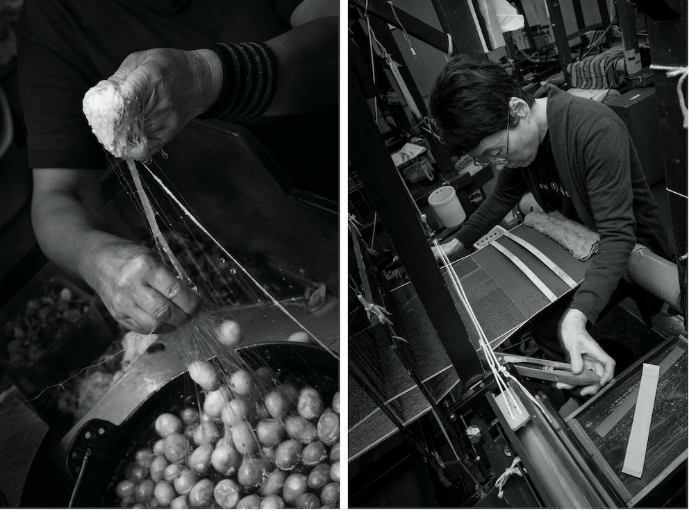 糸取りの伝統技法「のべびき」と工房での手織の様子