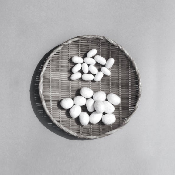 二頭の蚕が共同で一個の繭を作り上げたものが「玉繭」と呼ばれ、牛首紬はこの「玉繭」から生まれます。そして「玉繭」を煮込み、手作業で糸を紡ぎ出す「のべびき」という糸取りの伝統技法こそが牛首紬の命なのです。2本の糸が絡み合うことでできる糸の節が、2つとして同じものがない、特徴的な表情を作り上げます。