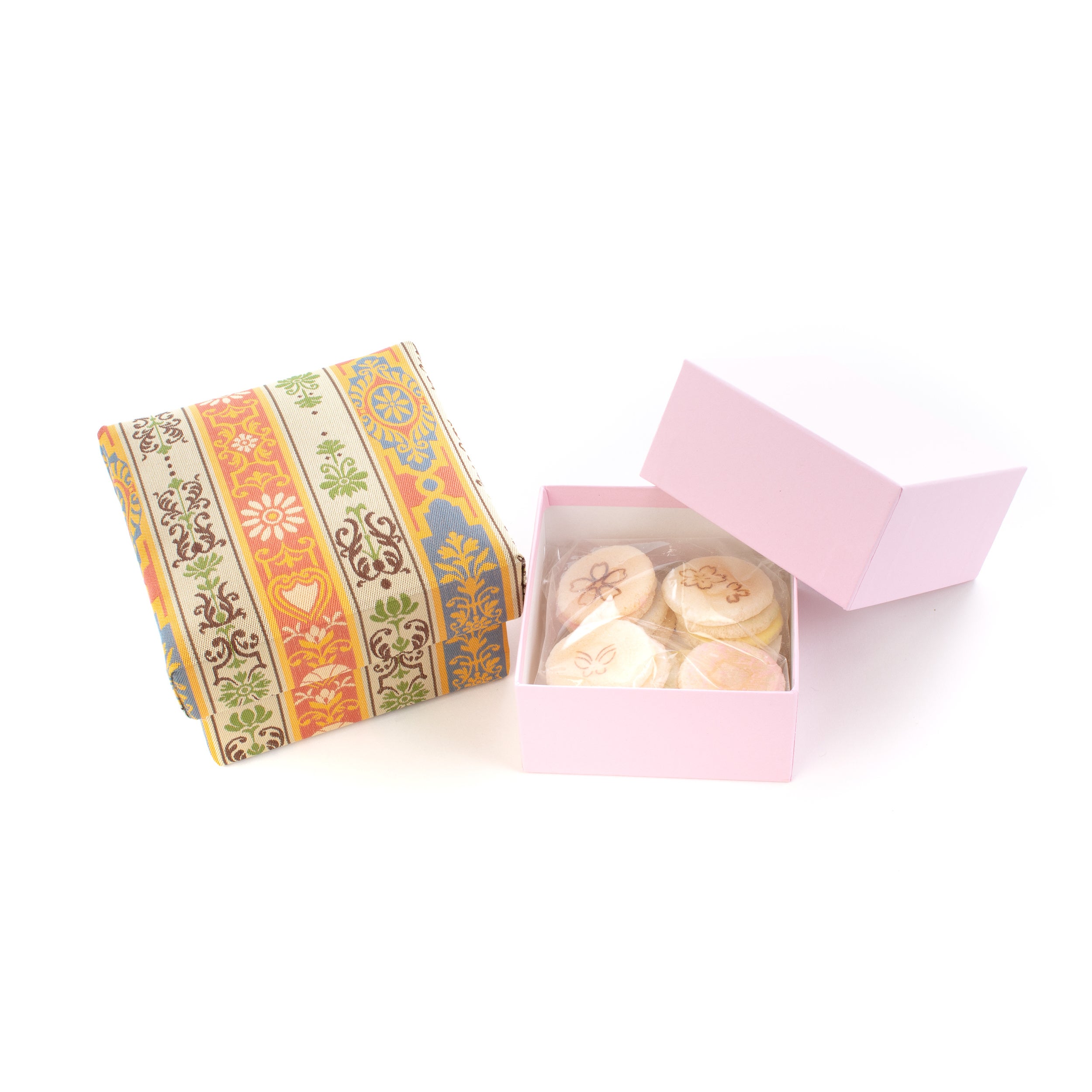毎回ご好評頂いている「京菓子司 末富」×「龍村美術織物」のコラボ企画の最新作として、このたび「【春限定】花こばこ」をご用意致しました。龍村美術織物の絹織物『ロワール飾花文』を使用した特製の箱に、花や蝶などの焼印を施した、末富の『京ふうせん』の詰め合わせをお入れした、数量限定商品となっております。