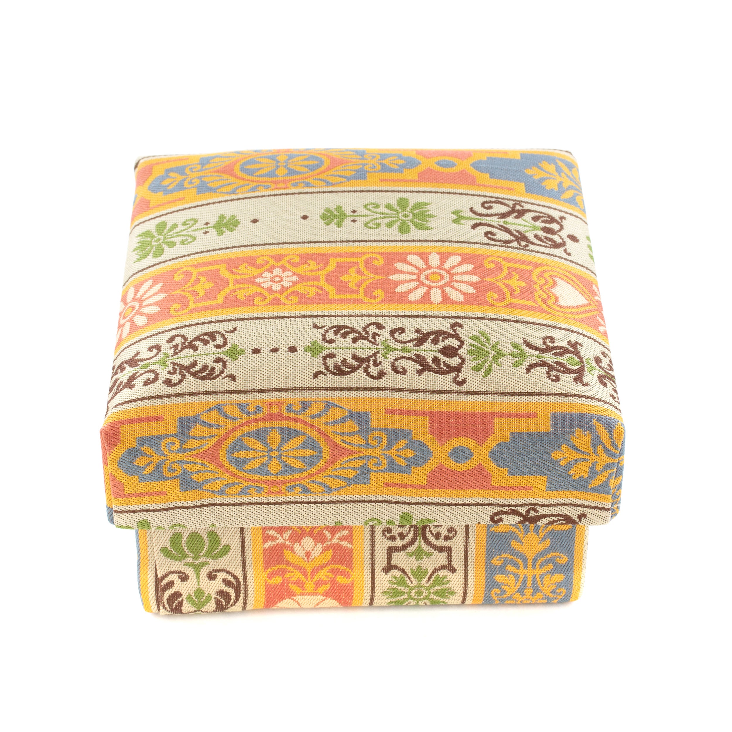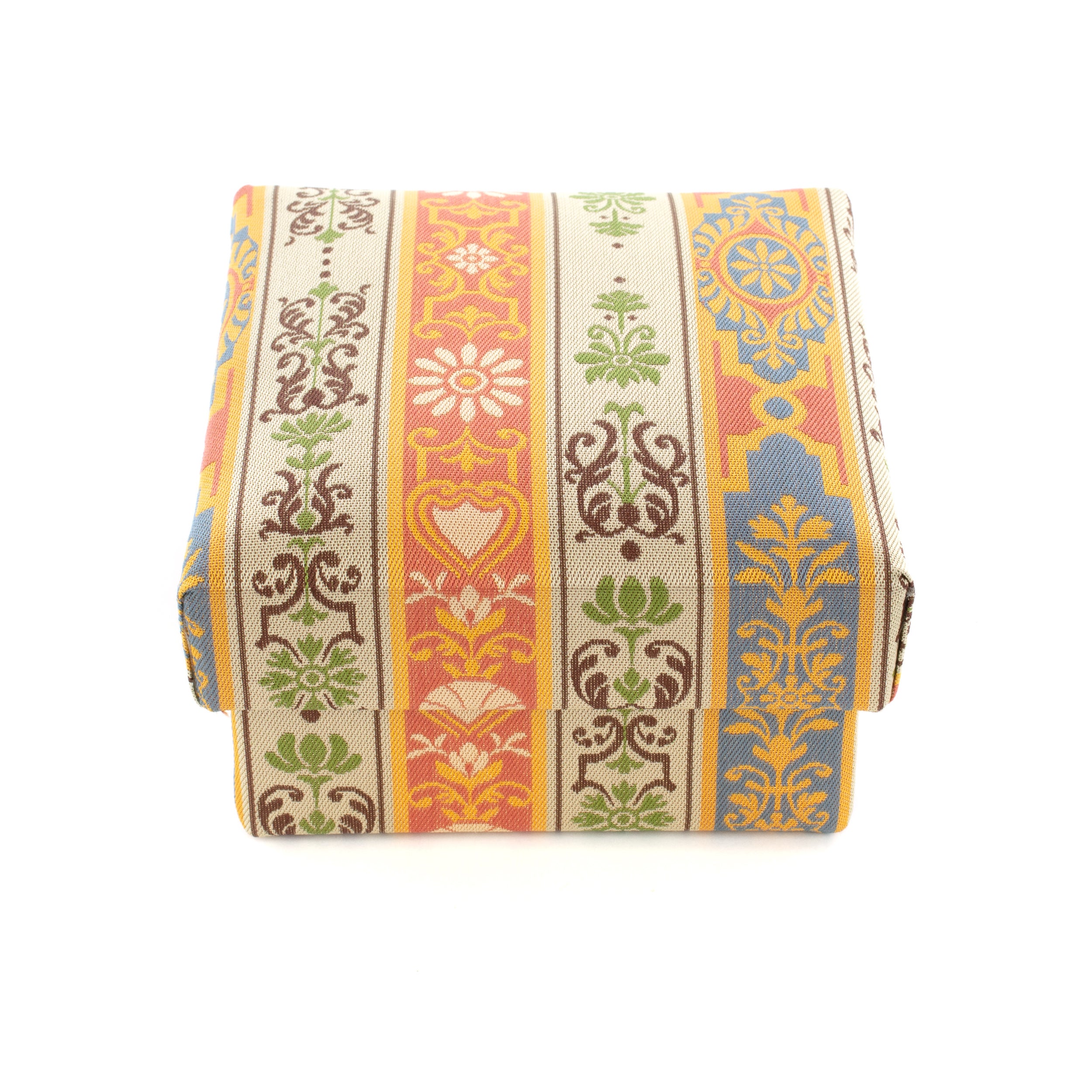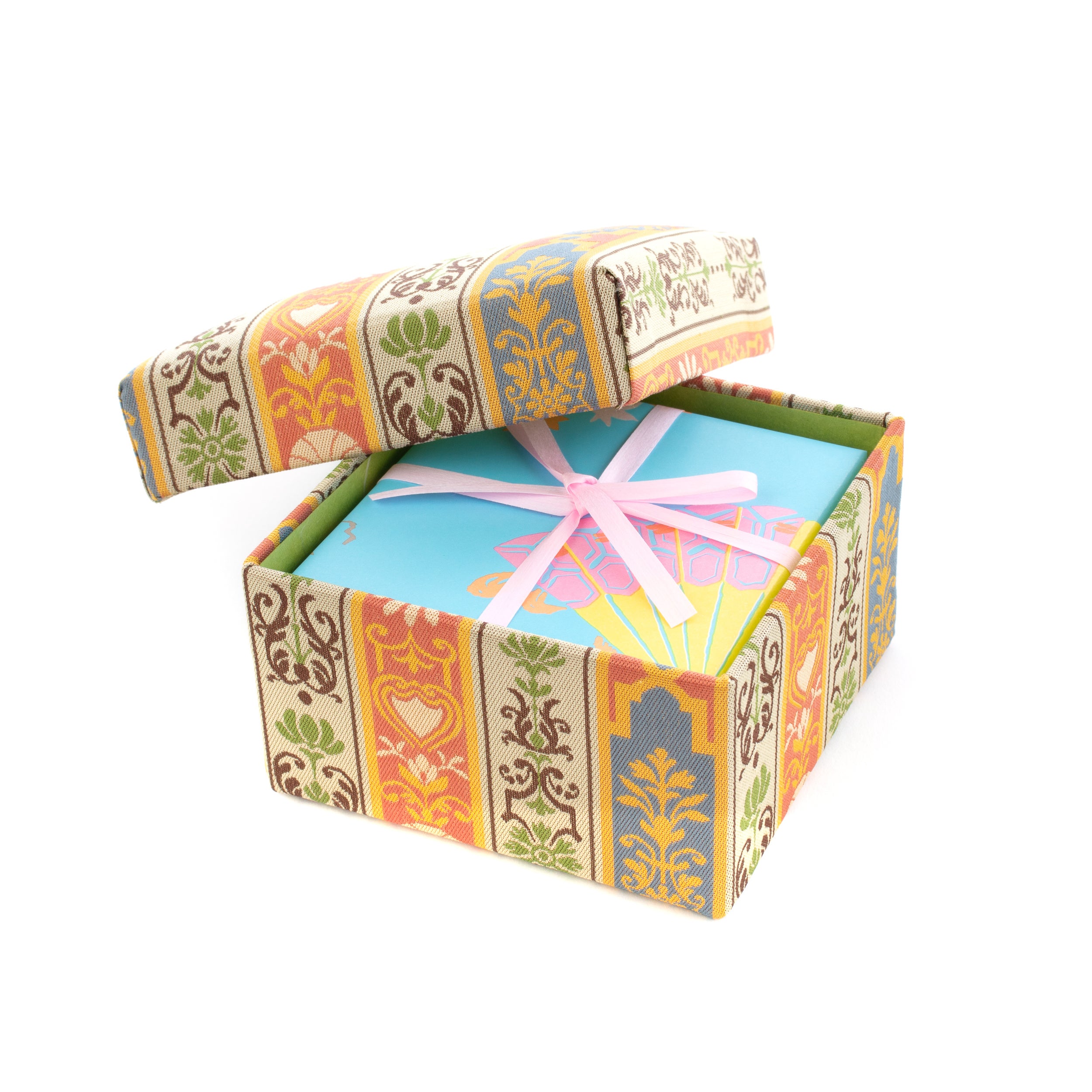 ギフトボックスに使用されている「龍村美術織物」の『ロワール飾花文』は、フランスのロワール河畔に建つ多くの城に残された、華麗な装飾がモチーフです。光沢のある滑らかな絹織物にて表現された幾何学文様や草花の柄は、小箱のある空間をより一層華やかに演出し、春らしく暖かい、柔らかな雰囲気をお楽しみ頂けます。