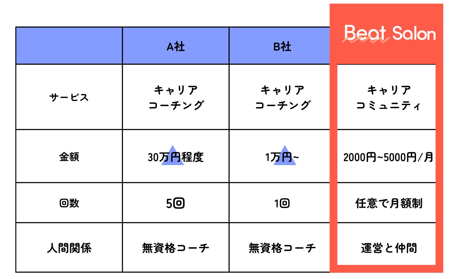 ・キャリアコーチングなら数ヶ月で数十万円。Beat Salonなら月額2,000~から気軽にスタート!