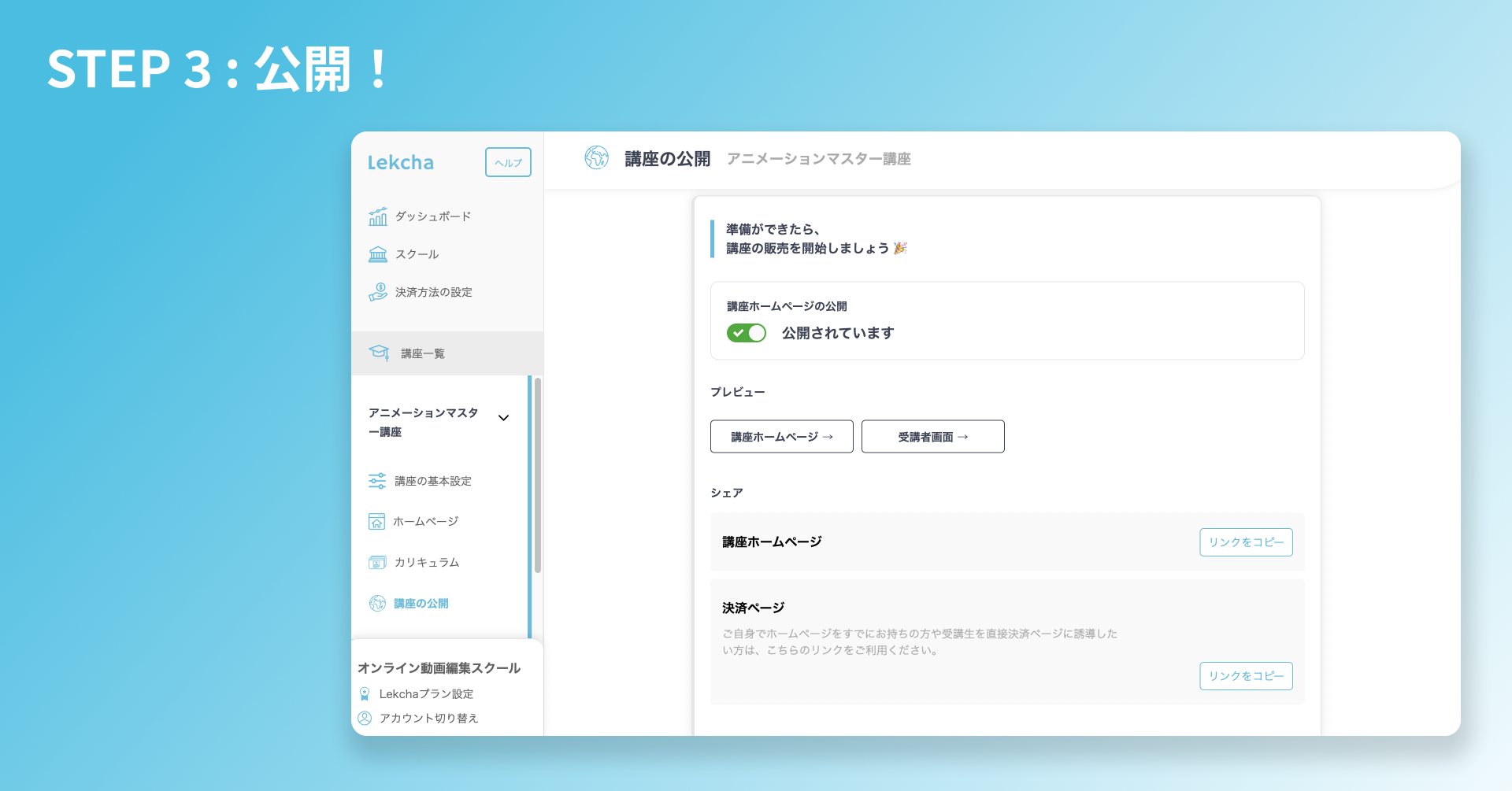 講座の公開は、ワンクリックで完了です。準備が整ったら、ホームページのリンクをコピーして、SNSやブログなどであなたのファンに届けましょう。