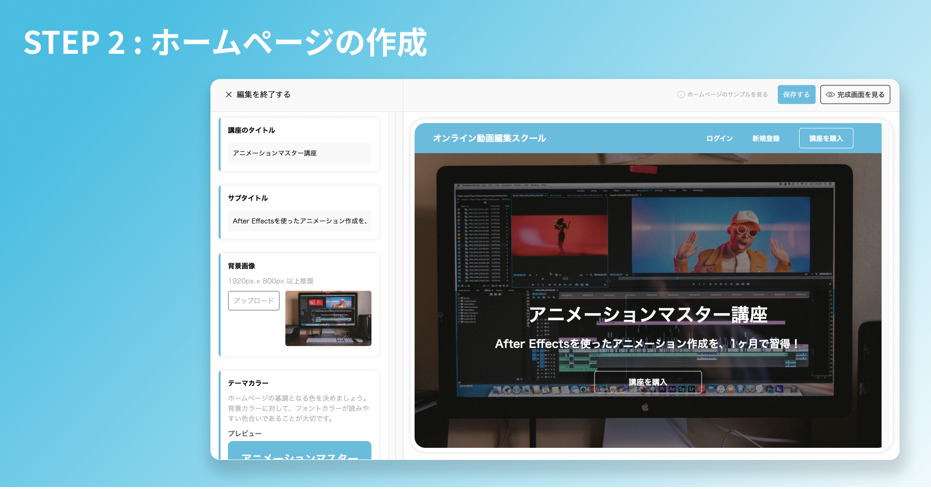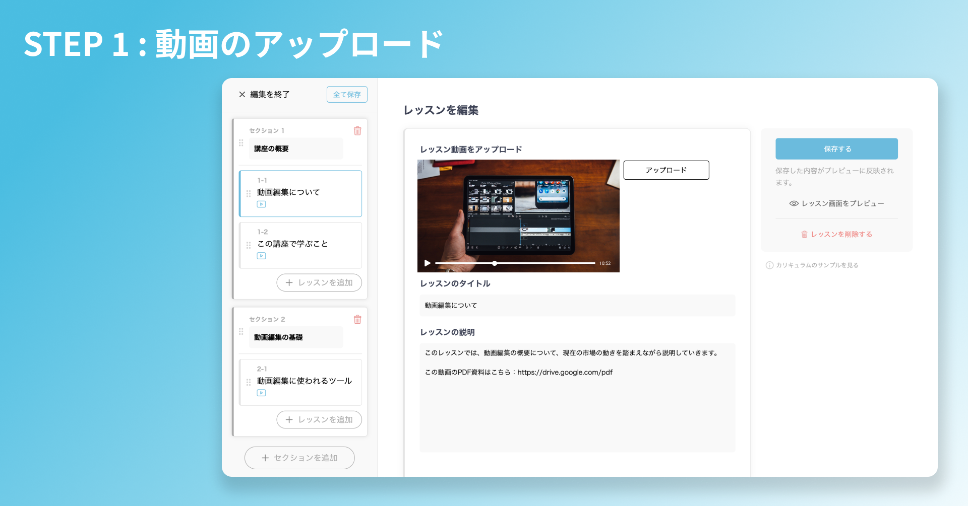 動画のアップロードや説明文の挿入も、既存のツールに比べてとても簡単にできます。レッスンの組み立てや並び替えは自由自在なので、体系的な講座カリキュラムを作れます。