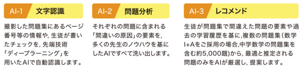 「AIチューター・ゼロ」には3つのAIが搭載されています。1つは生徒がアプリで問題集を撮影する際に用いる文字認識技術です。2つ目は問題分析で、各問題に含まれる間違いの原因となる要素を洗い出すものです。3つ目はレコメンドで、生徒が間違えた問題の要素や学習履歴を踏まえ、過去別学年で学習した単元まで遡って、生徒が解くべき問題を提案するものです。