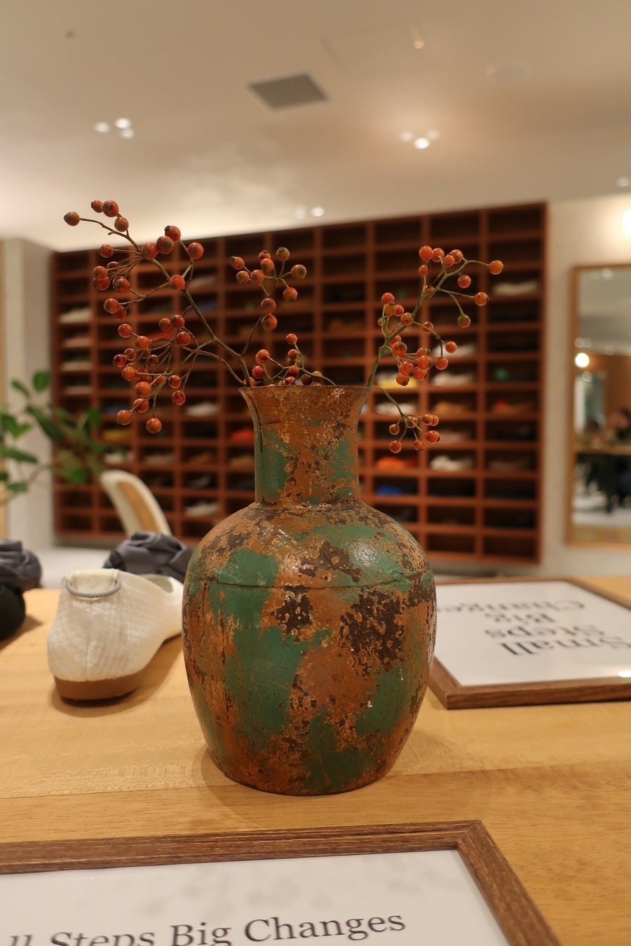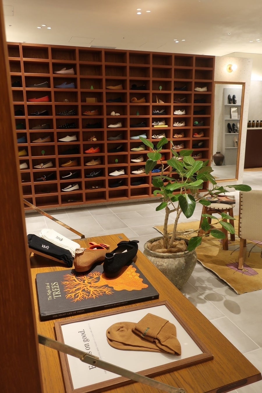 また、シューズと共にディスプレイされるオブジェたちは、健康な森を育て間伐し木材を生産する山師であり、木を加工して作品を作るwood artist。両軸の活動を通して真摯に山や木と向き合い、正しい知識や情報を伝えることを目指す高橋成樹さんの作品スツールを使用。世界各国から買い付けたキネマトグラフさんのビンテージの品々が並ぶ心地の良い空間に仕上がっています。